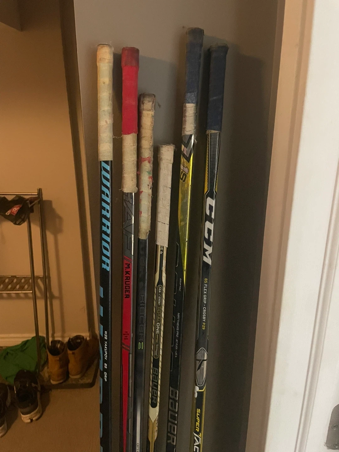 Selling a collection of hockey sticks from various brands including Easton, Bauer, CCM, and Warrior. These sticks are suitable for recreational play or as backups. Used condition with some wear and tear.