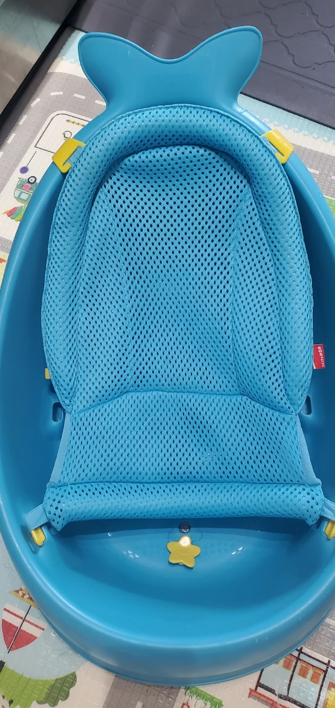 Blue baby bath tub with a mesh sling for support. It's made of plastic and has yellow clips to hold the sling. Features a cute whale design on the headrest and a yellow star accessory.