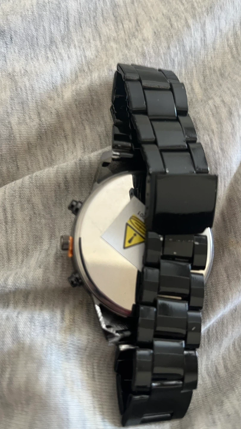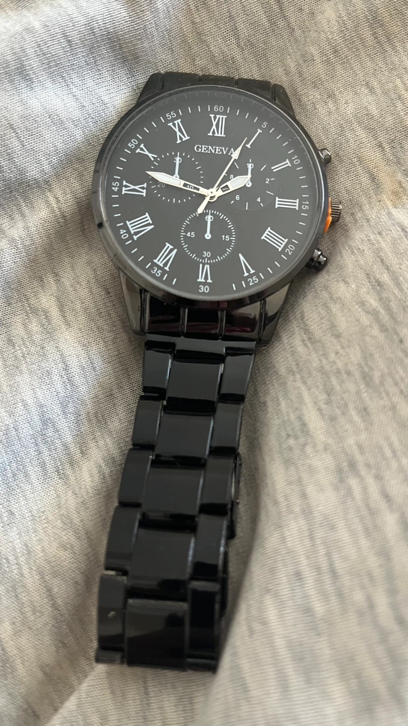 Black metal Geneva chronograph watch with Roman numeral dial. It has a date window and sub-dials for tracking minutes and seconds. This watch offers a sleek and classic look.