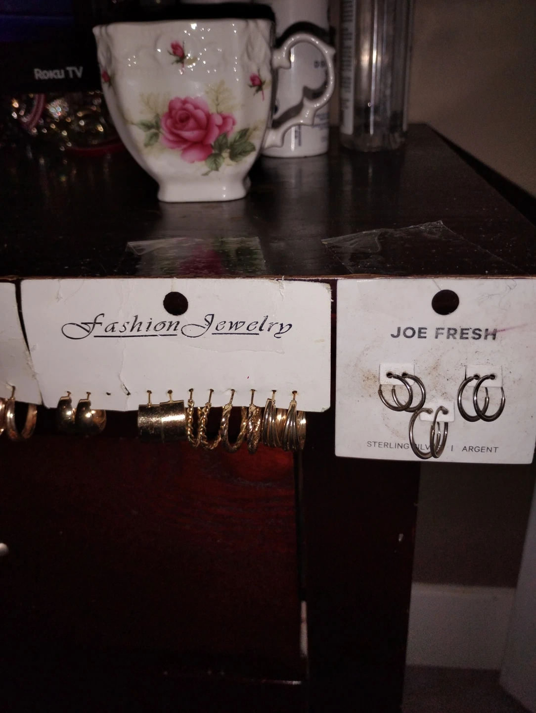 This is a set of fashion jewelry earrings. Includes a pack of assorted gold-toned hoops and a pack of silver-toned hoops from Joe Fresh. These earrings are suitable for everyday wear.