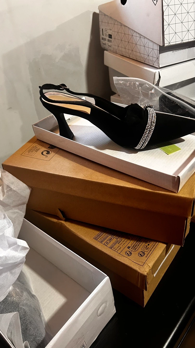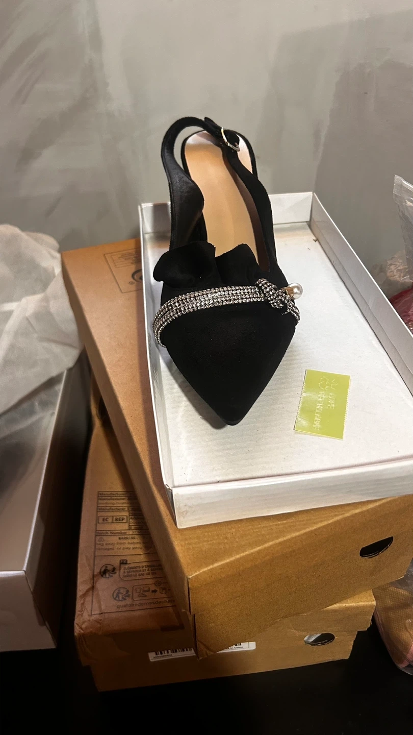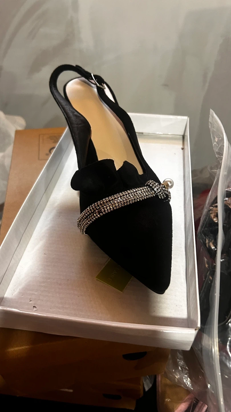 These elegant black slingback heels feature a pointed toe and a decorative bow adorned with rhinestones and a pearl accent. They have an adjustable strap for a secure fit. Perfect for dressing up any outfit! Never worn.