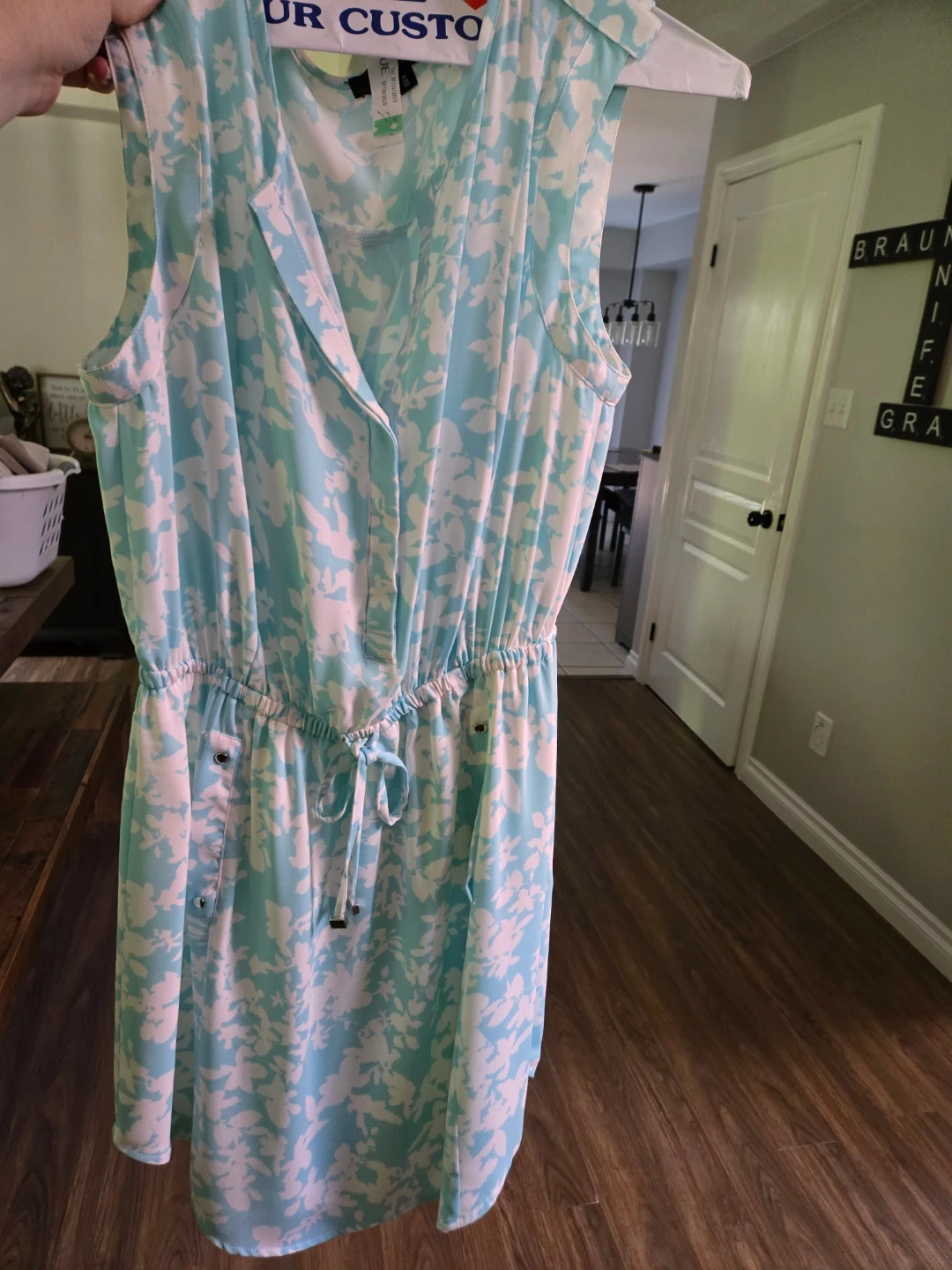 Dynamite sleeveless shirt dress with a blue and white floral print. It features a drawstring waist and a button-up neckline. Size medium.