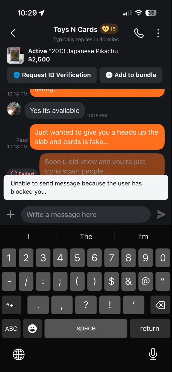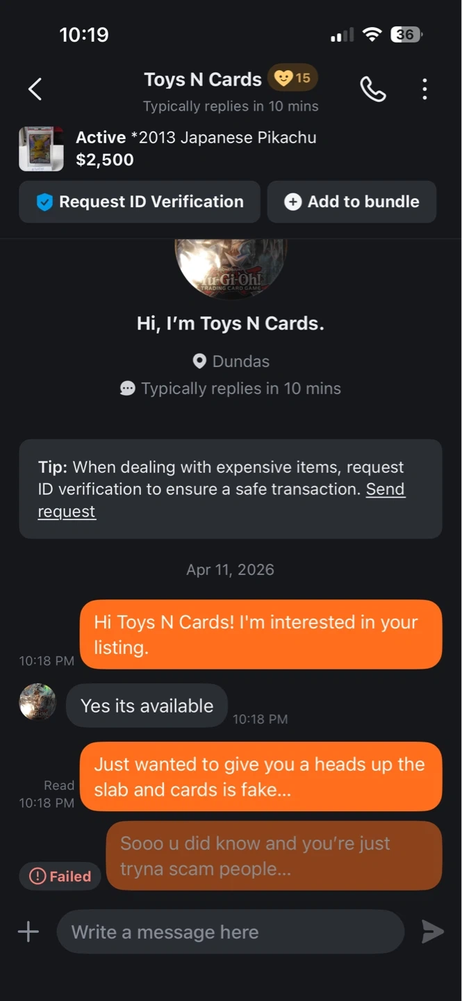 Buy & Sell**FAKE SLABS****FAKE SLABS**FreeBeware of this dude, selling fakes slabs!! When I told him he blocked me… They sell pokemon and yugioh Be safe out thereWHERE TO MEETGerrard SquareView MapSELLERKevin ZhangLeslieville24024 reviews2 chats·5 favorites·185 viewsSEND CHAT TO SELLERHi Kevin Zhang! I’m interested in your listing.Hi Kevin Zhang! I’m interested in your listing.Get the Karrot app to chatSign In to chat