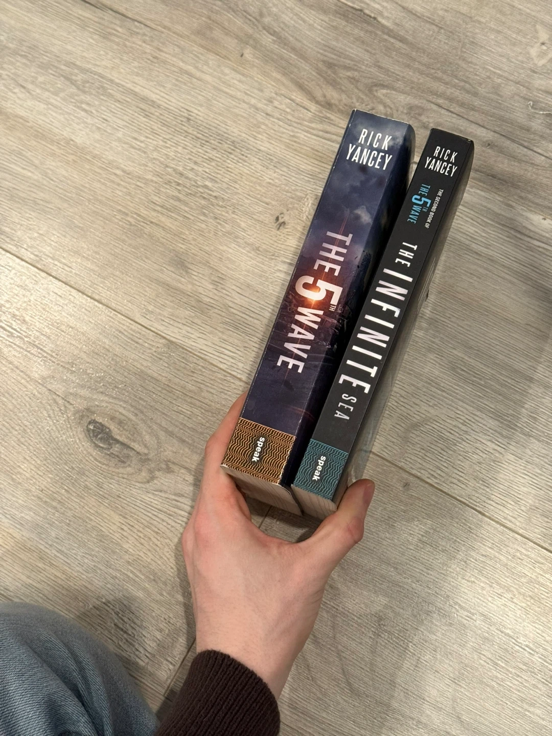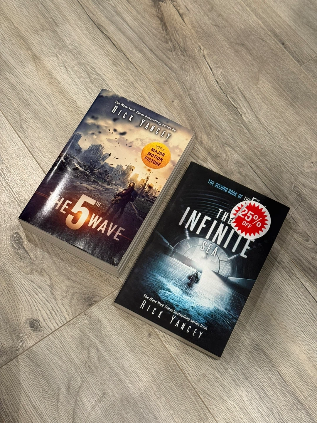 These are paperback copies of The 5th Wave and The Infinite Sea, both written by Rick Yancey. They're part of a bestselling series. Fans of dystopian young adult novels will enjoy these titles.