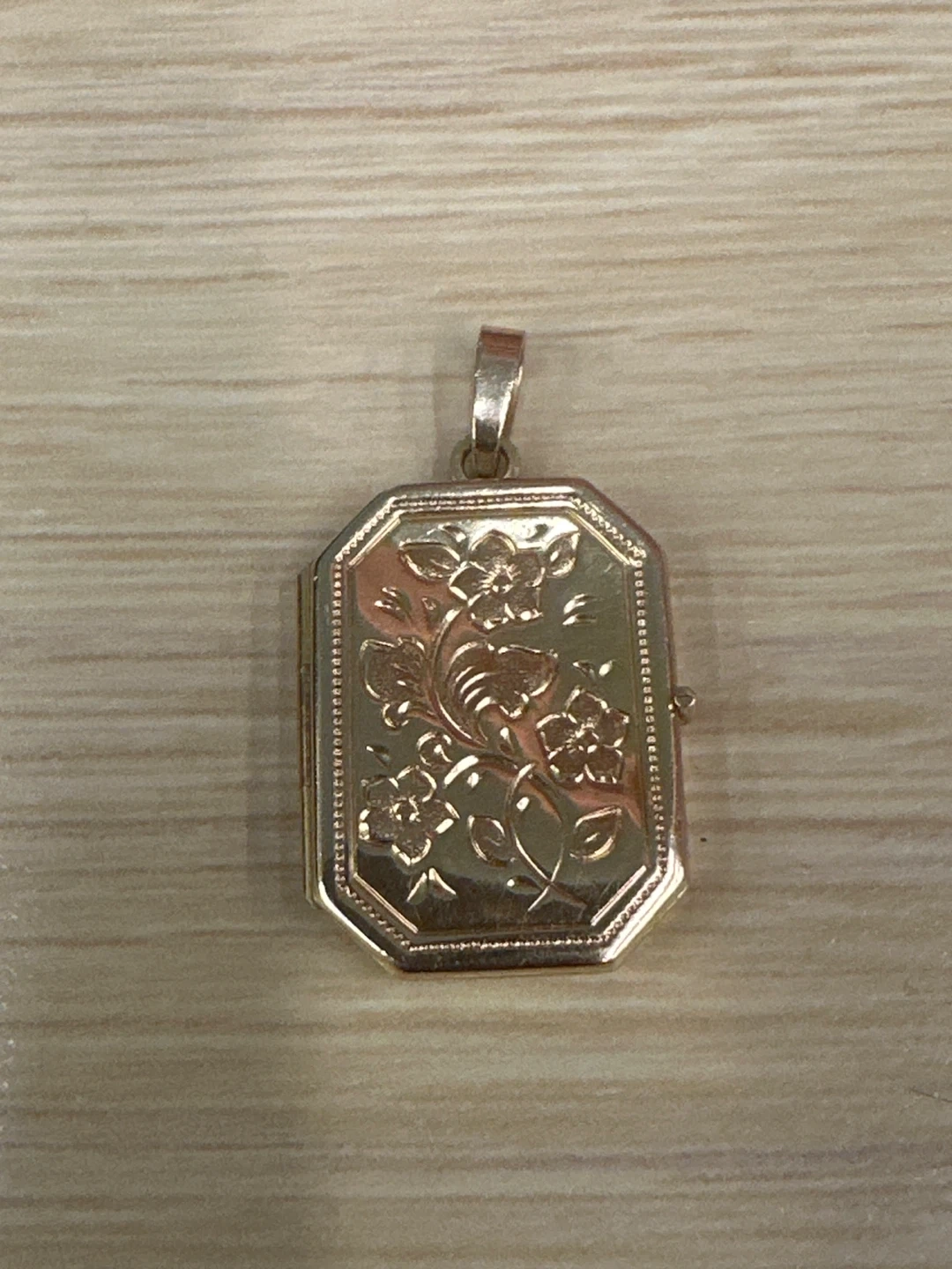 This is a beautiful vintage locket pendant with an octagonal shape. It features an intricate floral engraving on the front. It opens to hold two small photos. It's a lovely piece for keeping cherished memories close. Authentic Gold for sale.