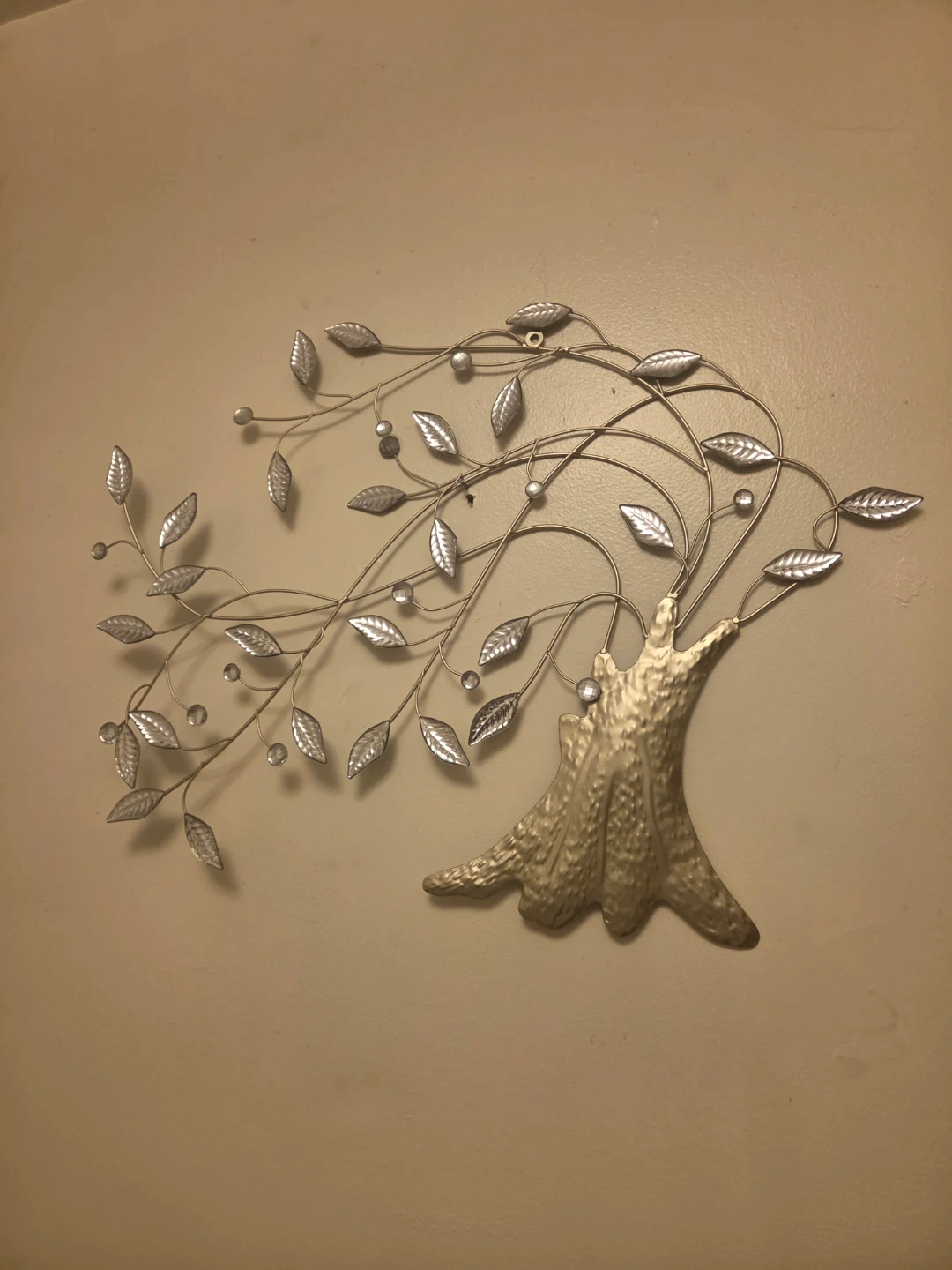 This is a decorative metal wall art piece shaped like a tree. It features a silver finish with delicate branches, leaves, and clear accents. It's designed to add a touch of nature to your home decor.