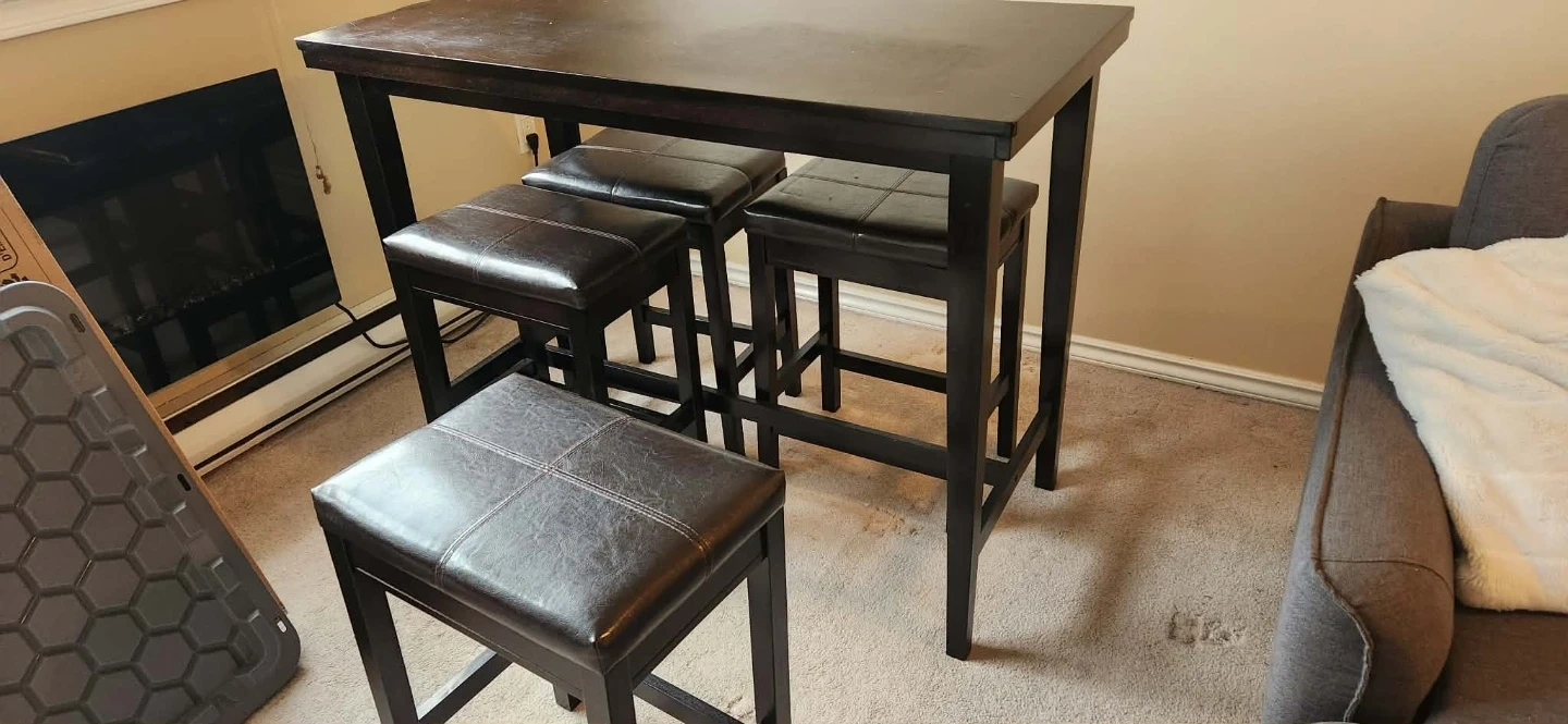 This is a dark wood dining set that includes a table and three matching stools. The stools have a faux leather upholstery. It's a compact set, perfect for smaller spaces. Some imperfections on top but still in great condition. Stools in perfect condition and very comfortable.