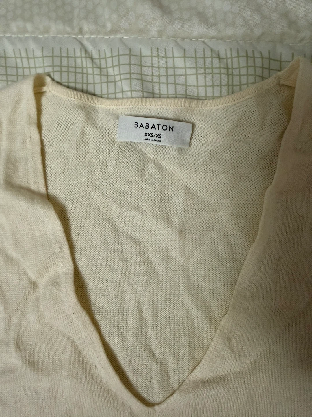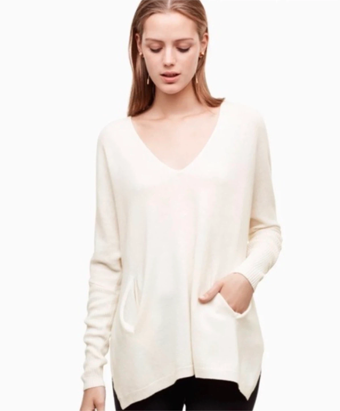 Selling a Babaton cream-coloured sweater in size XXS/XS but fits up to Medium. It's a comfy and stylish piece that's perfect for layering or wearing on its own. The sweater is in great condition and has a flattering V-neck design. It's made of soft material, so it feels great against the skin!