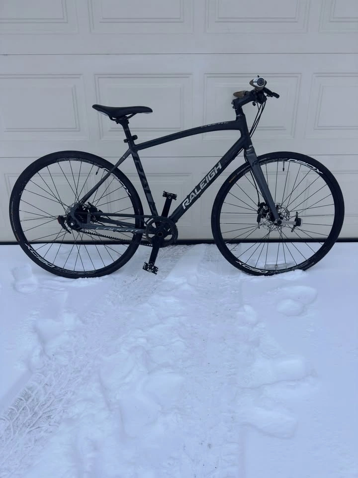 Selling my Raleigh bike. It has a belt drive (no greasy chain) and an internal gear hub. Disc brakes front and rear provide solid stopping power in all weather. 700c wheels give it a lightweight feel. Size: Medium. I’ve had it for 6 months.