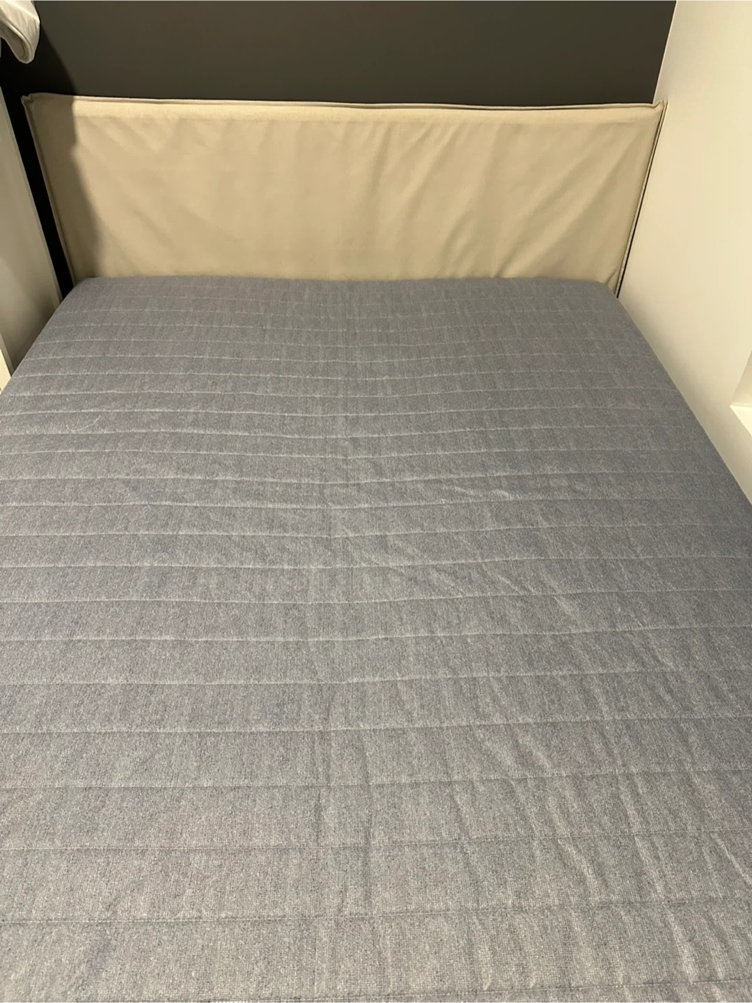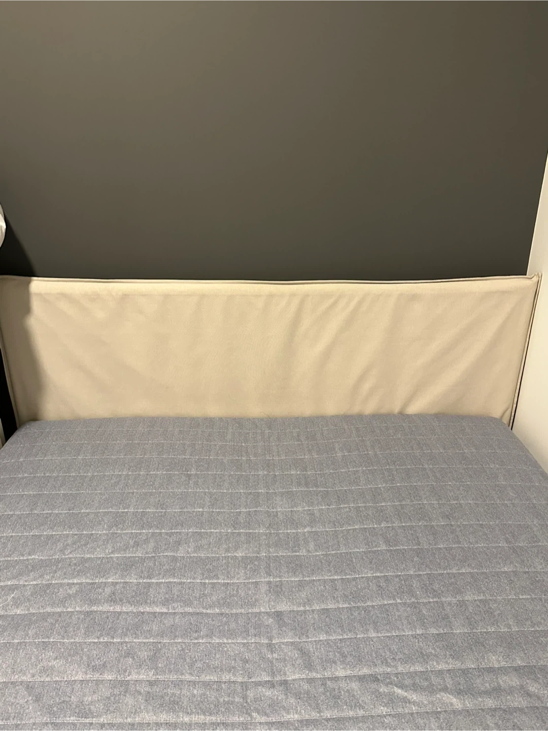 This is an IKEA KLEPPSTAD queen bed frame in white with Vissle beige headboard. It's a sturdy and stylish addition to any bedroom. The bed frame provides reliable support for your mattress.