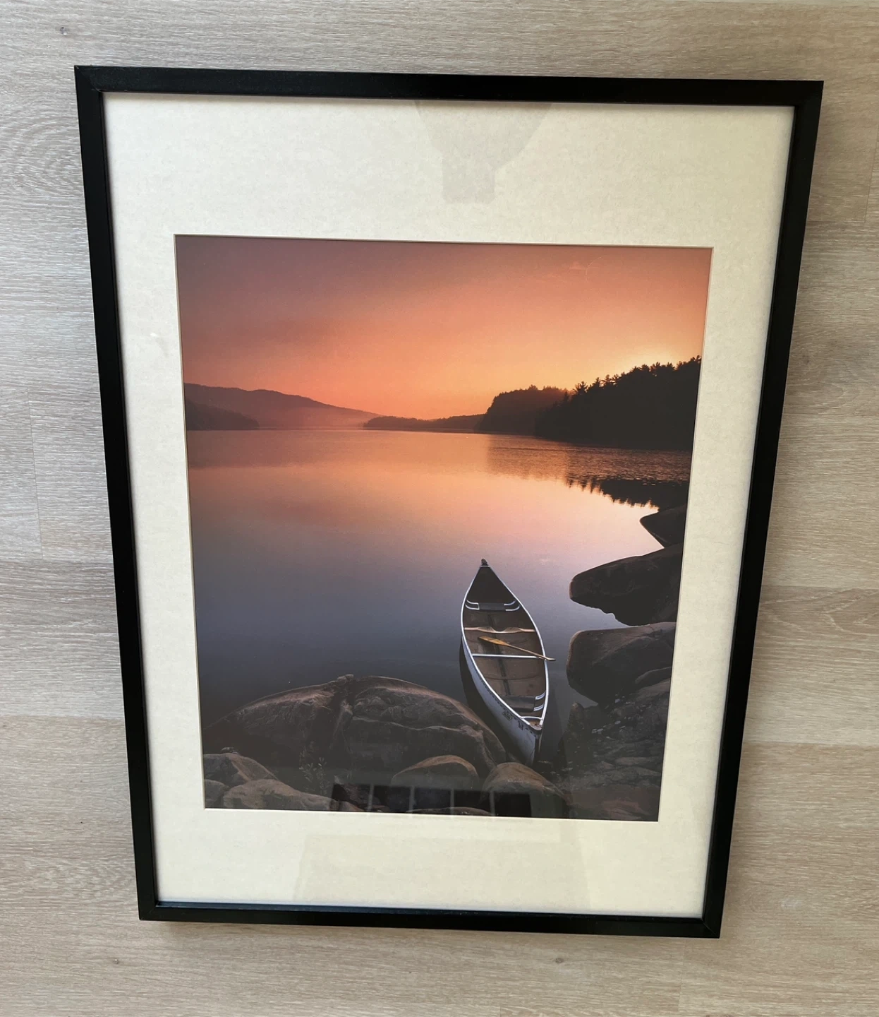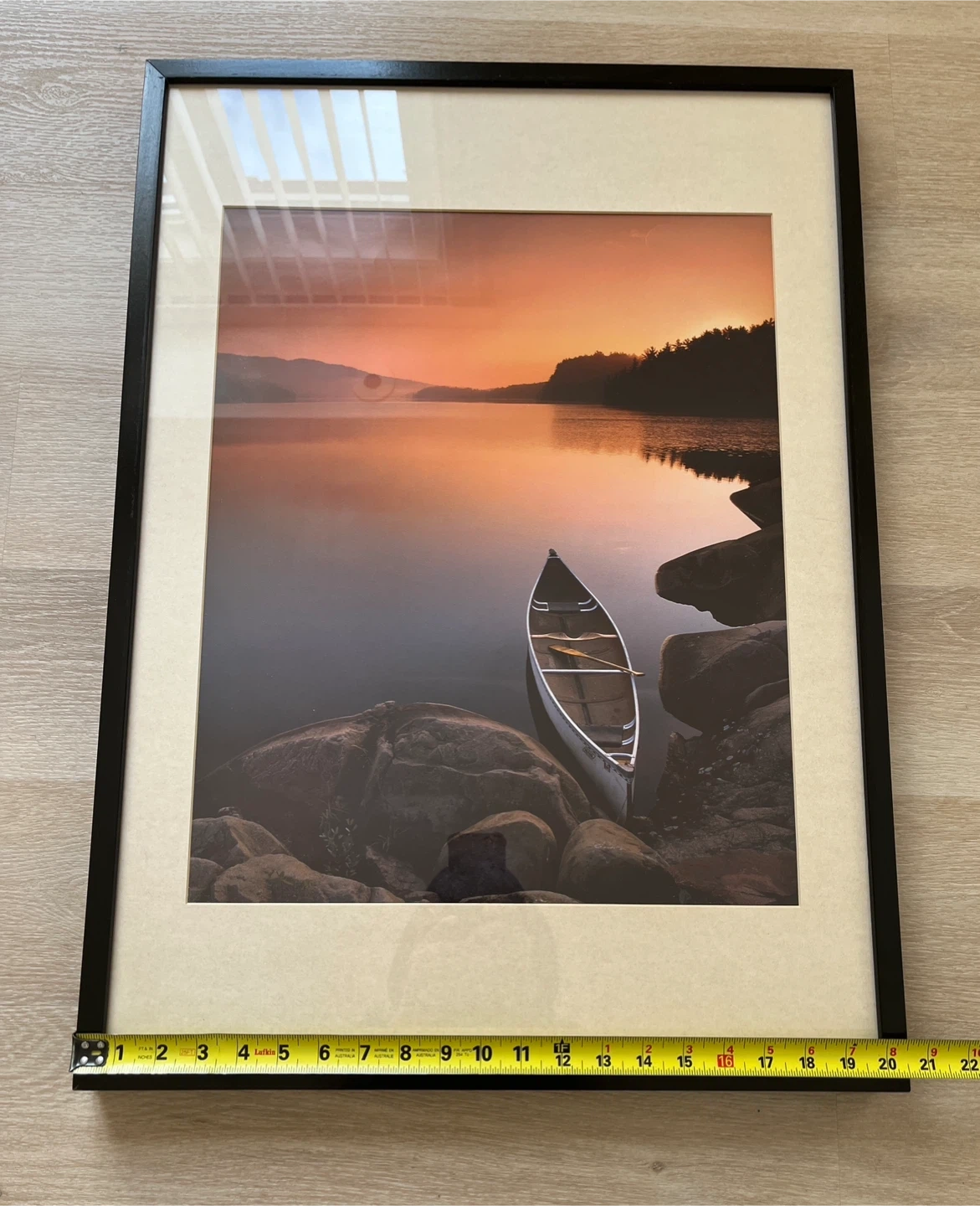 This framed print complete with a mat and black frame. Dimensions are approximately 22 inches tall by 16 inches wide and 1-1/4 depth inches. It's a lovely piece to add to any room!