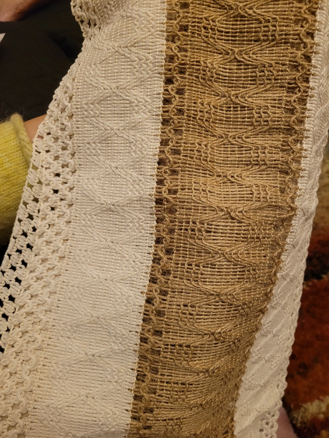 A woven table runner featuring white macrame-style borders and a central section with a natural jute texture. It has white fringe tassels on both ends. This runner adds a touch of rustic charm to your table setting.