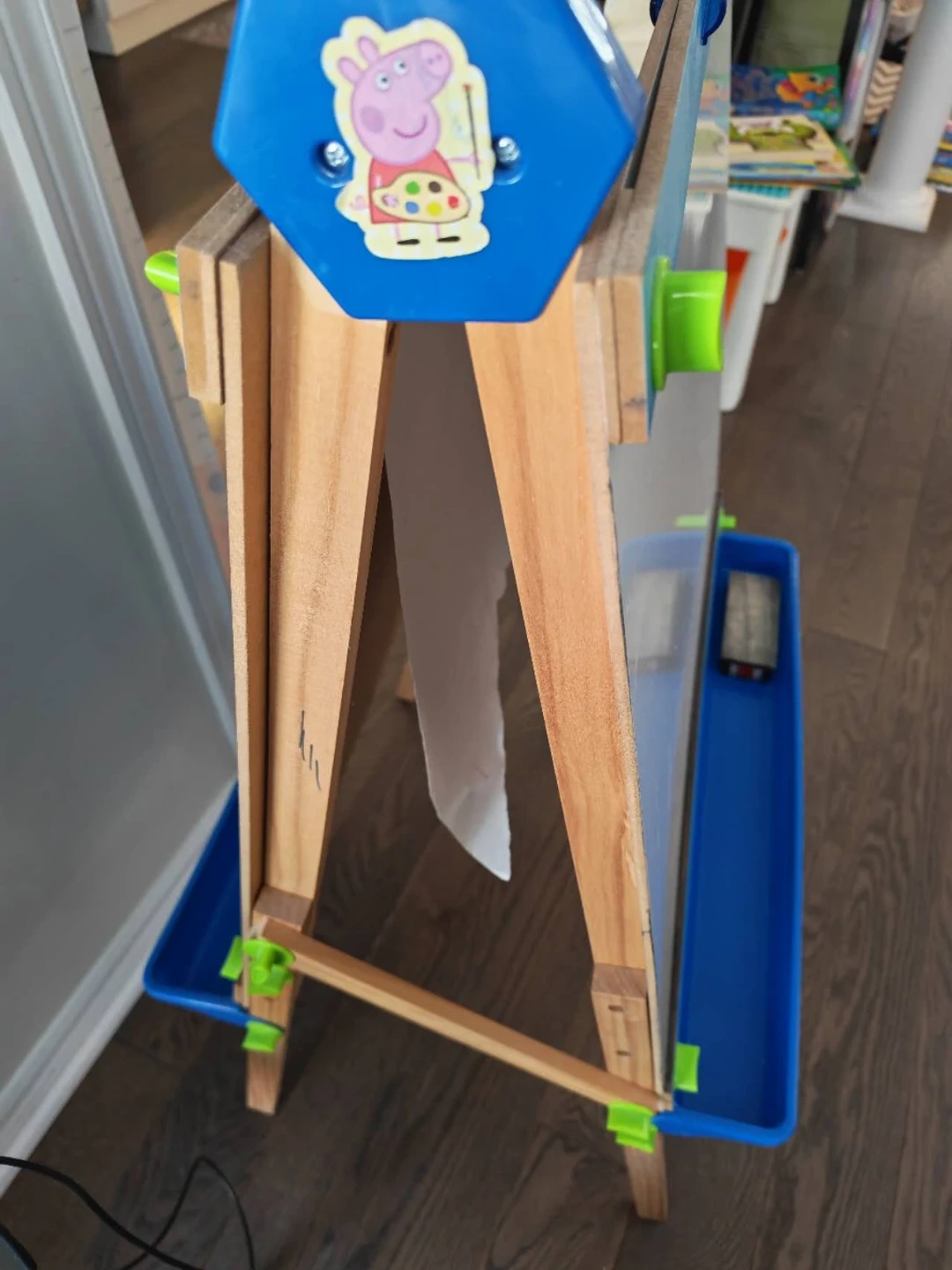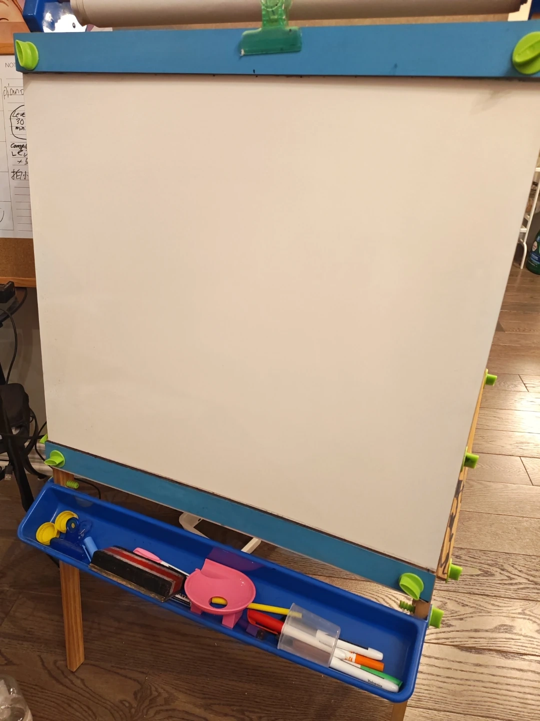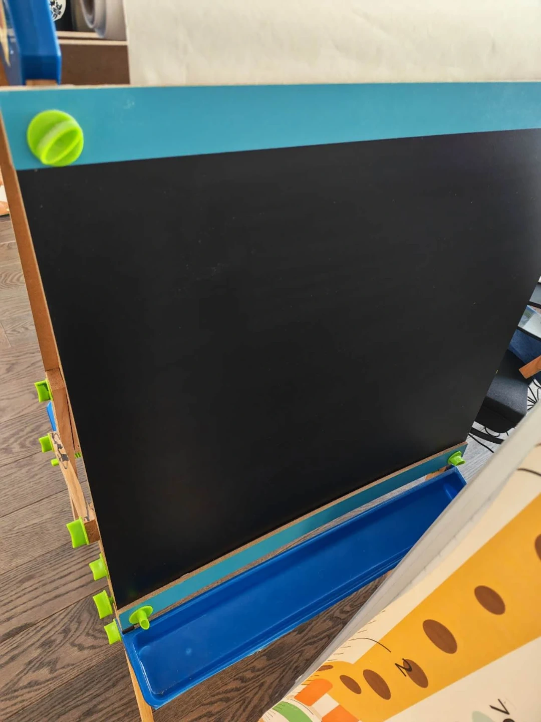 This double-sided easel features a chalkboard and a whiteboard, perfect for creative young artists. It comes with a built-in tray to hold art supplies. The height is adjustable for growing kids! Great for home or classroom use.