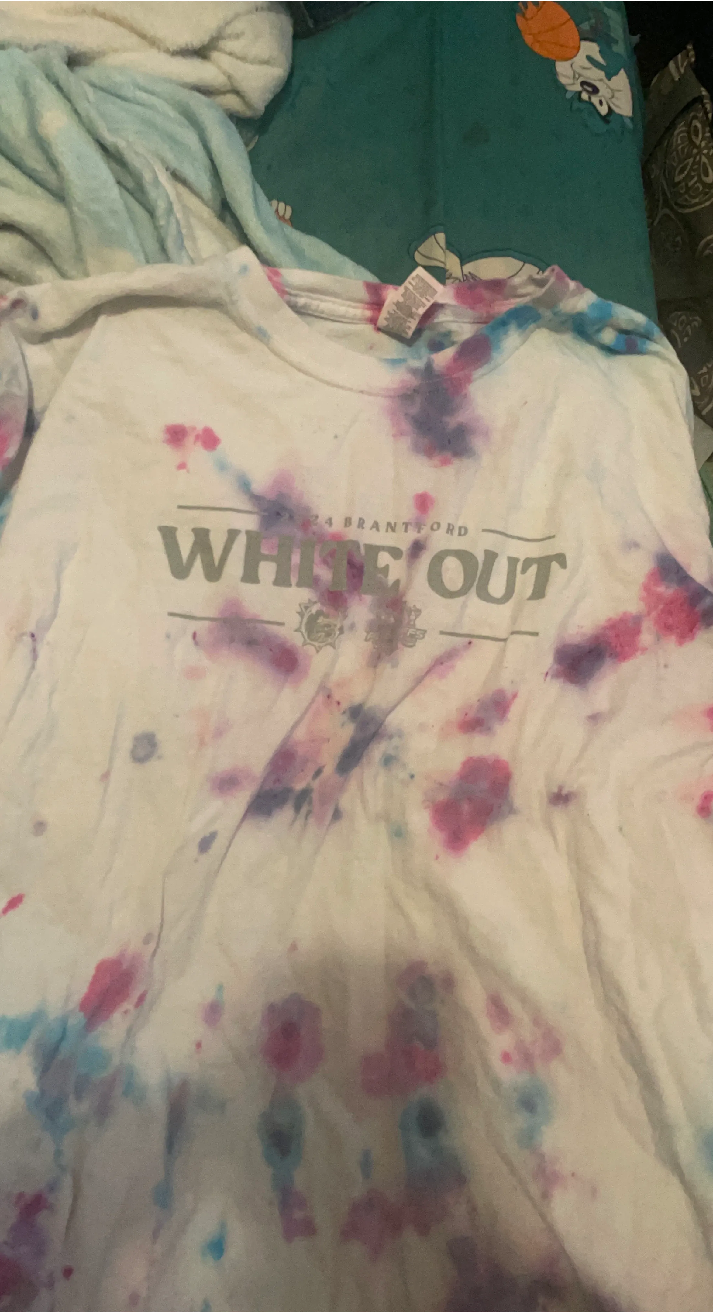 This tie-dye t-shirt features a white base with blue and pink splatter accents. It proudly displays "WHITE OUT" on the front and "WE ARE BRANTFORD" on the back. It's a comfortable addition to any casual wardrobe.