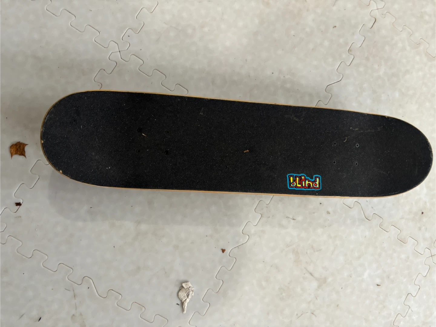This is a Blind skateboard. It features a vibrant, multi-coloured graphic on the bottom. The grip tape on top is black and shows some signs of wear. It's ready for your next skate session!