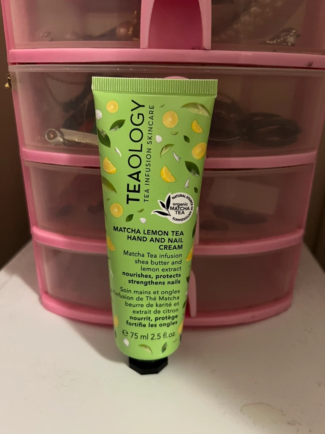 Teaology Matcha Lemon Hand and Nail Cream. Features matcha tea infusion, shea butter, and lemon extract. Nourishes, protects, and strengthens hands and nails. 75 ml tube.