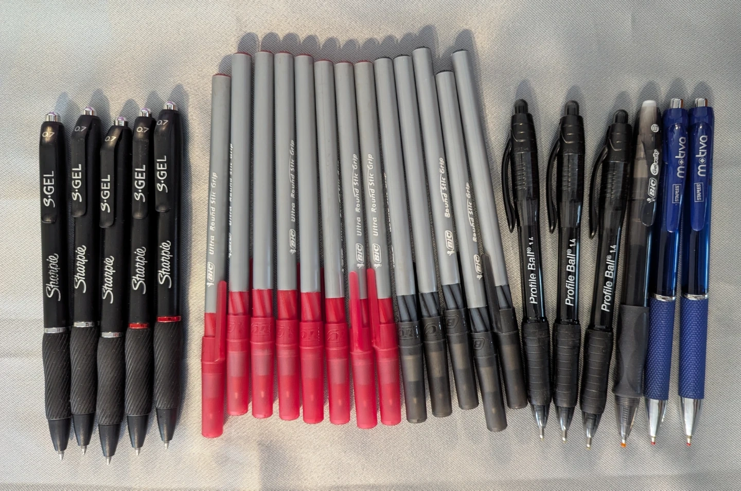 24 pens including Sharpie S-Gel, BIC Ultra Round Stic Grip, BIC Profile Ball, and Motiva pens.