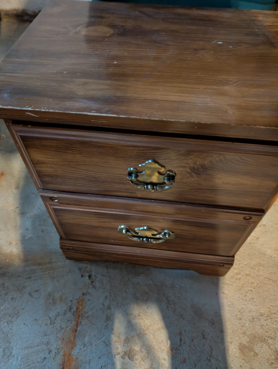 A compact wooden nightstand with two drawers. It features ornate brass-coloured drawer pulls. The wood finish shows some signs of wear.