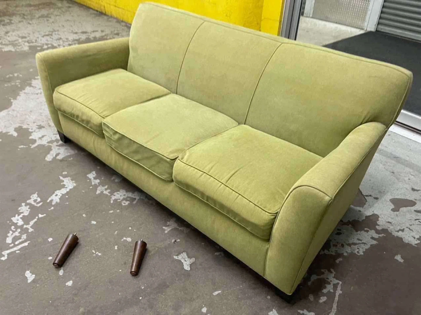 This is a light green sofa with three seat cushions and a three-section back. It has rolled arms. Legs are detached for transport. Fabric upholstery.