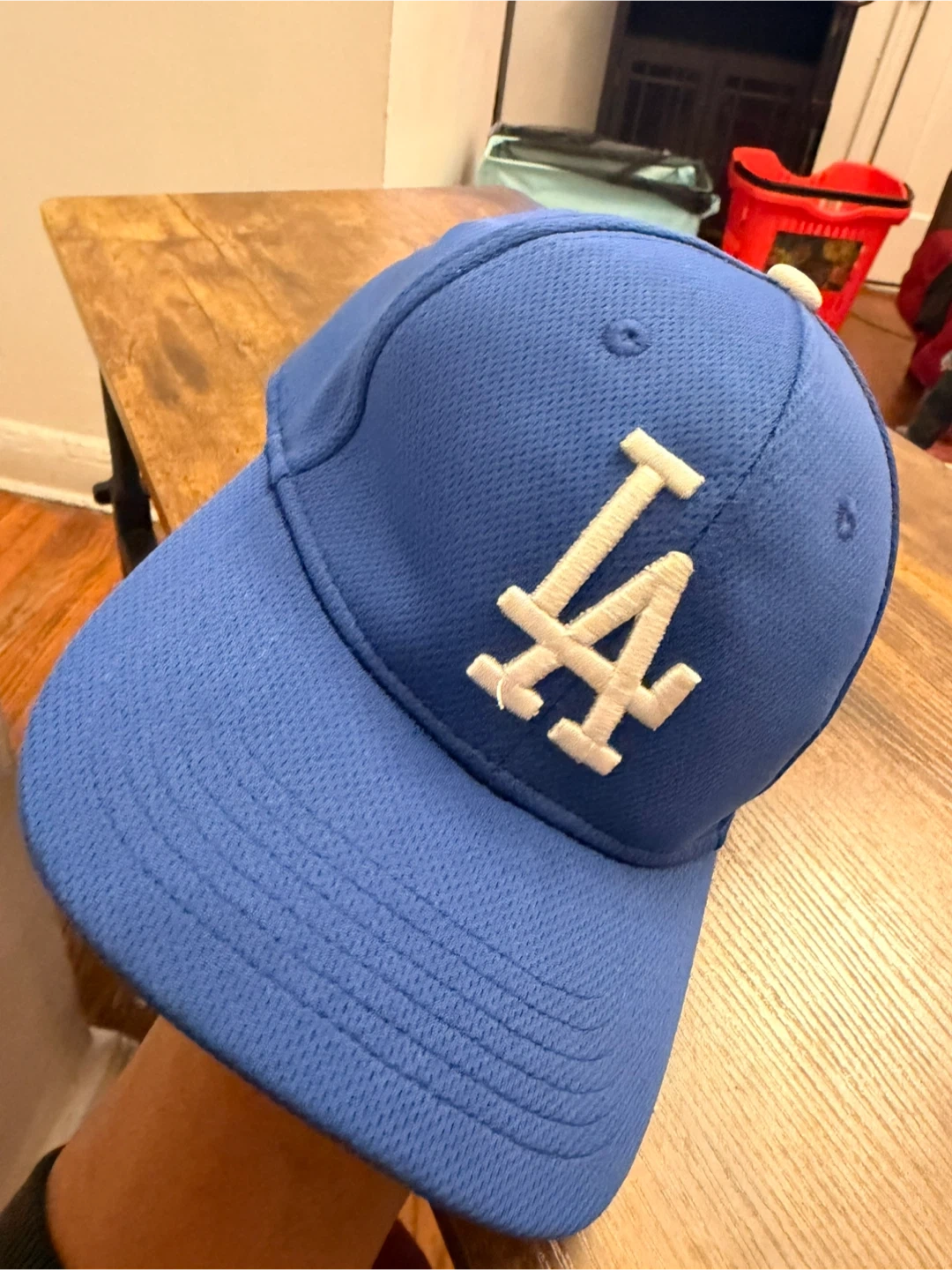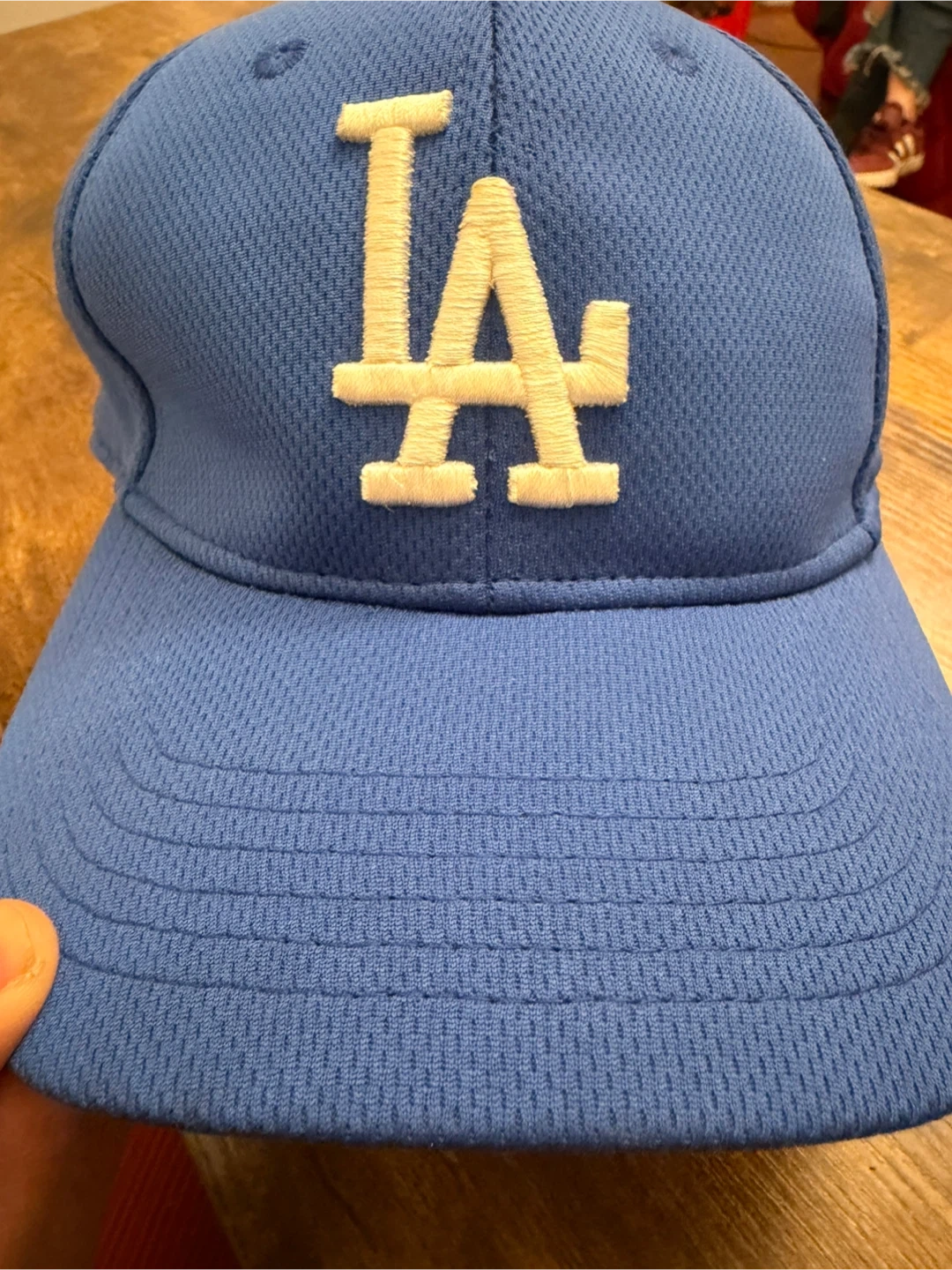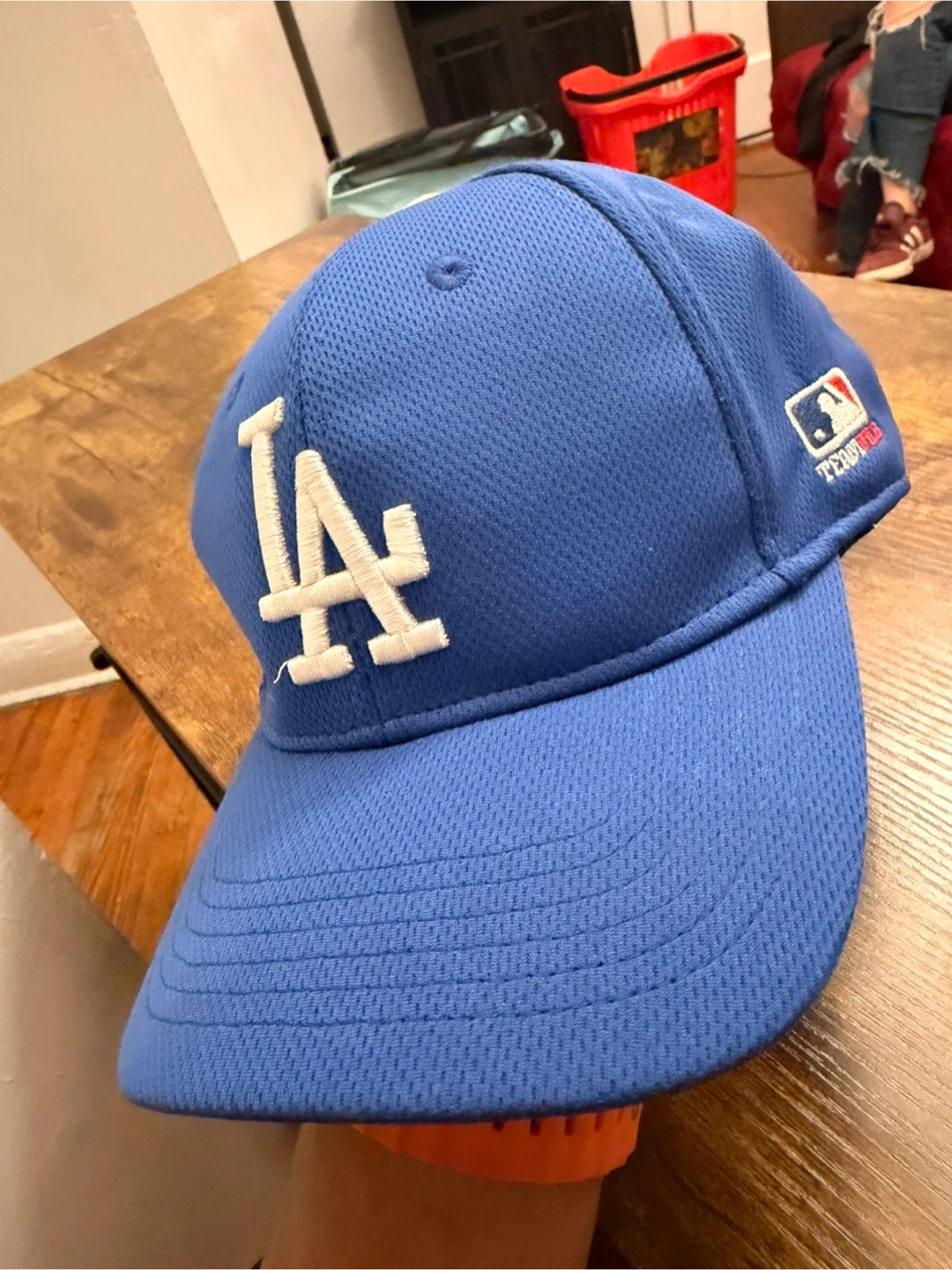 This is a blue Los Angeles Dodgers baseball cap with the iconic LA logo embroidered on the front. It features a textured fabric and a standard brim. The MLB Team logo is visible on the side.