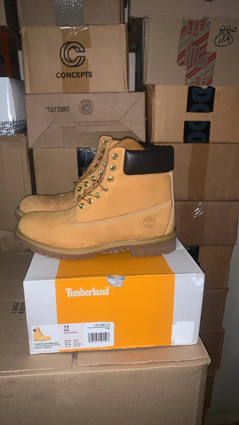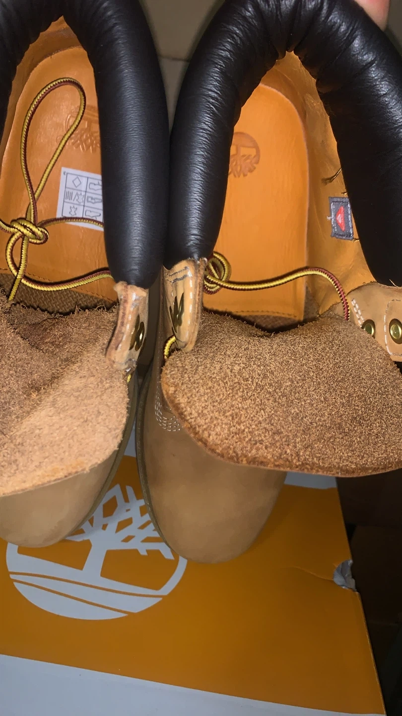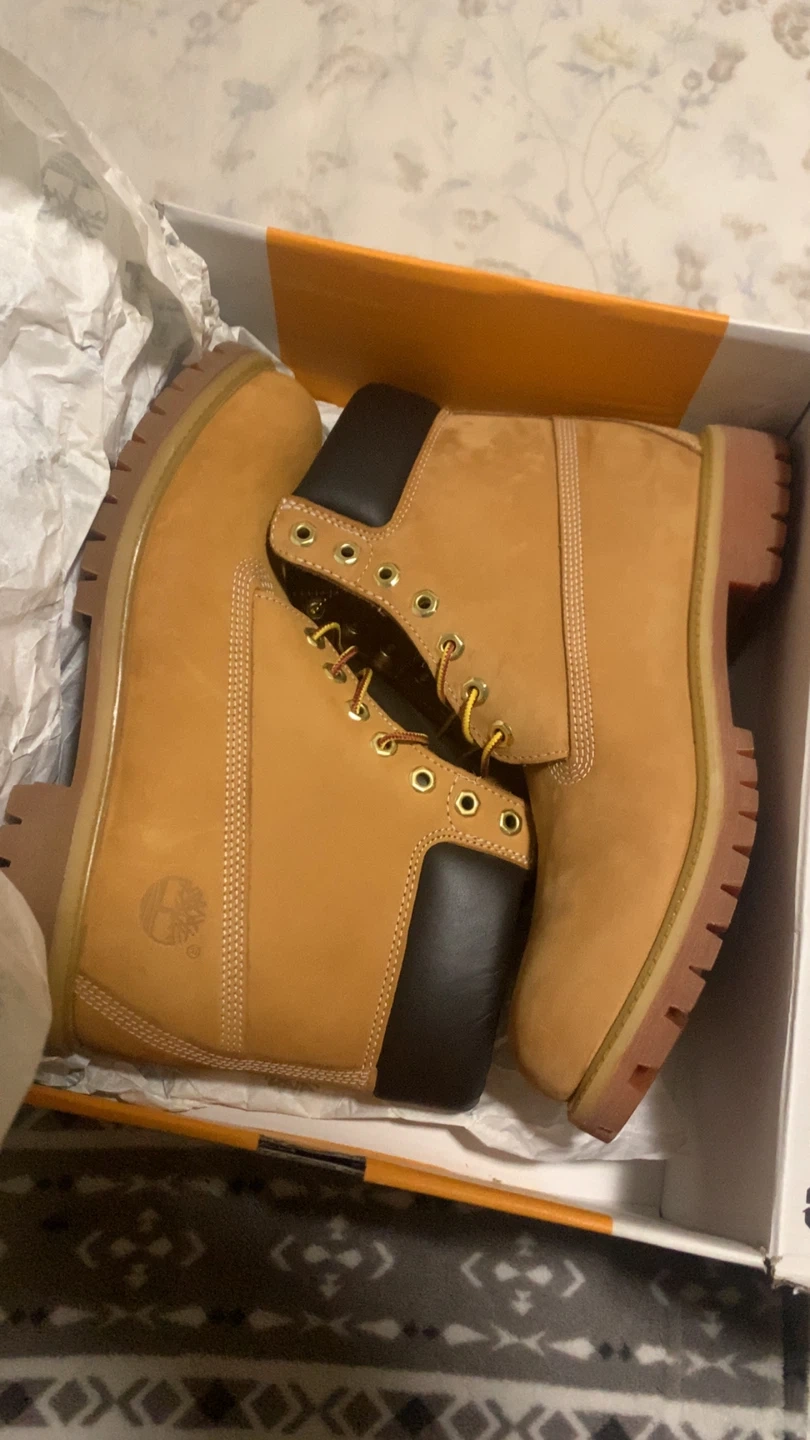 Authentic Timberland boots in good condition! These are a size 11 and come with the original box. They feature a tan leather upper with a black padded collar. Perfect for all weather!Used just once and supper clean and excellent condition