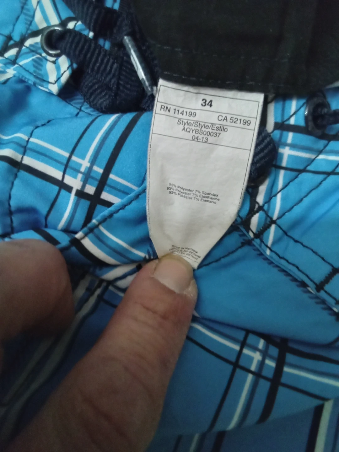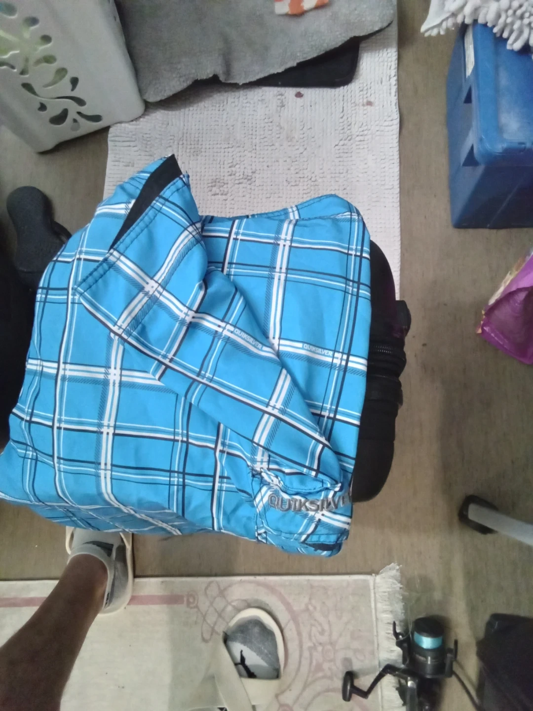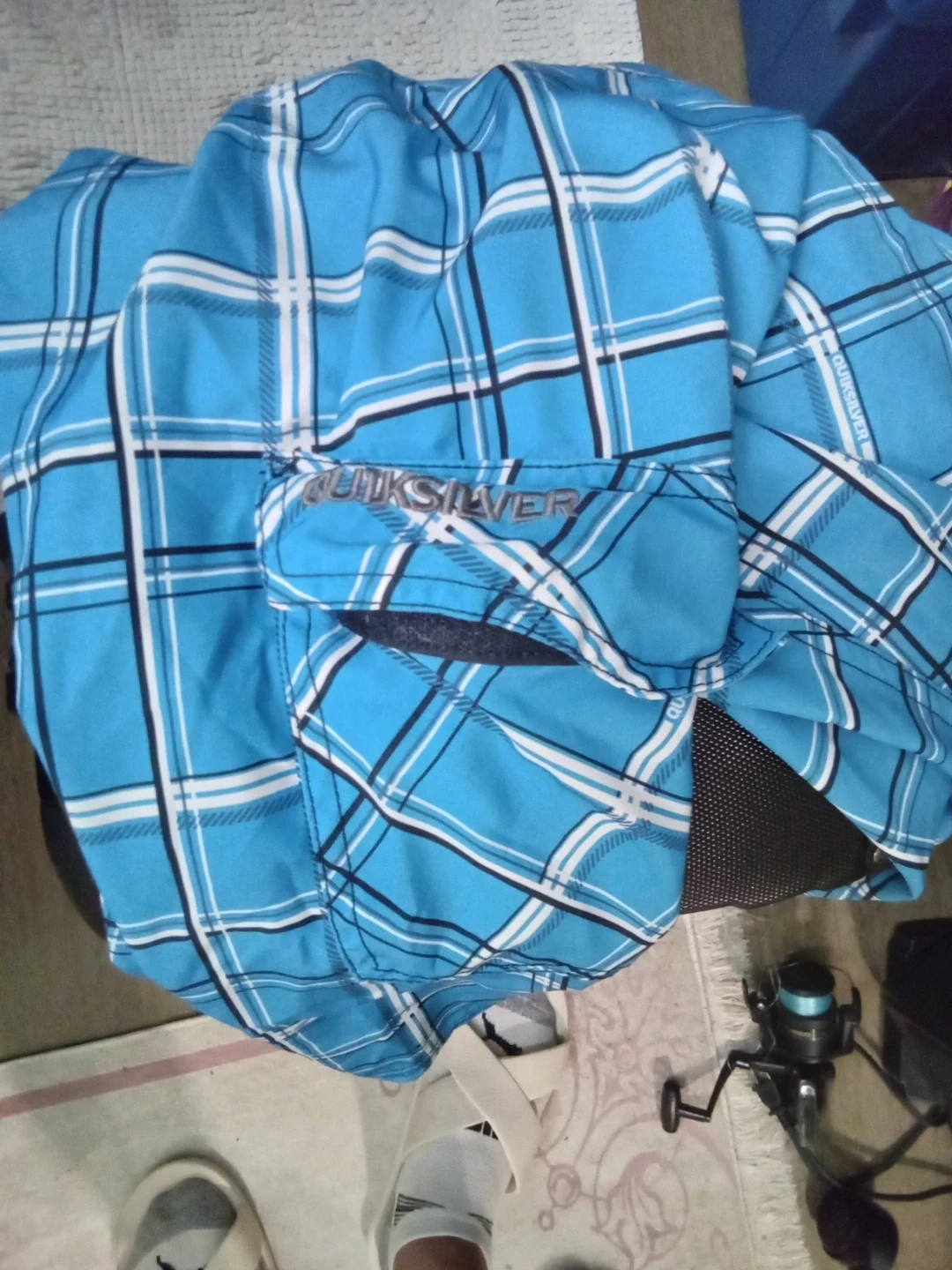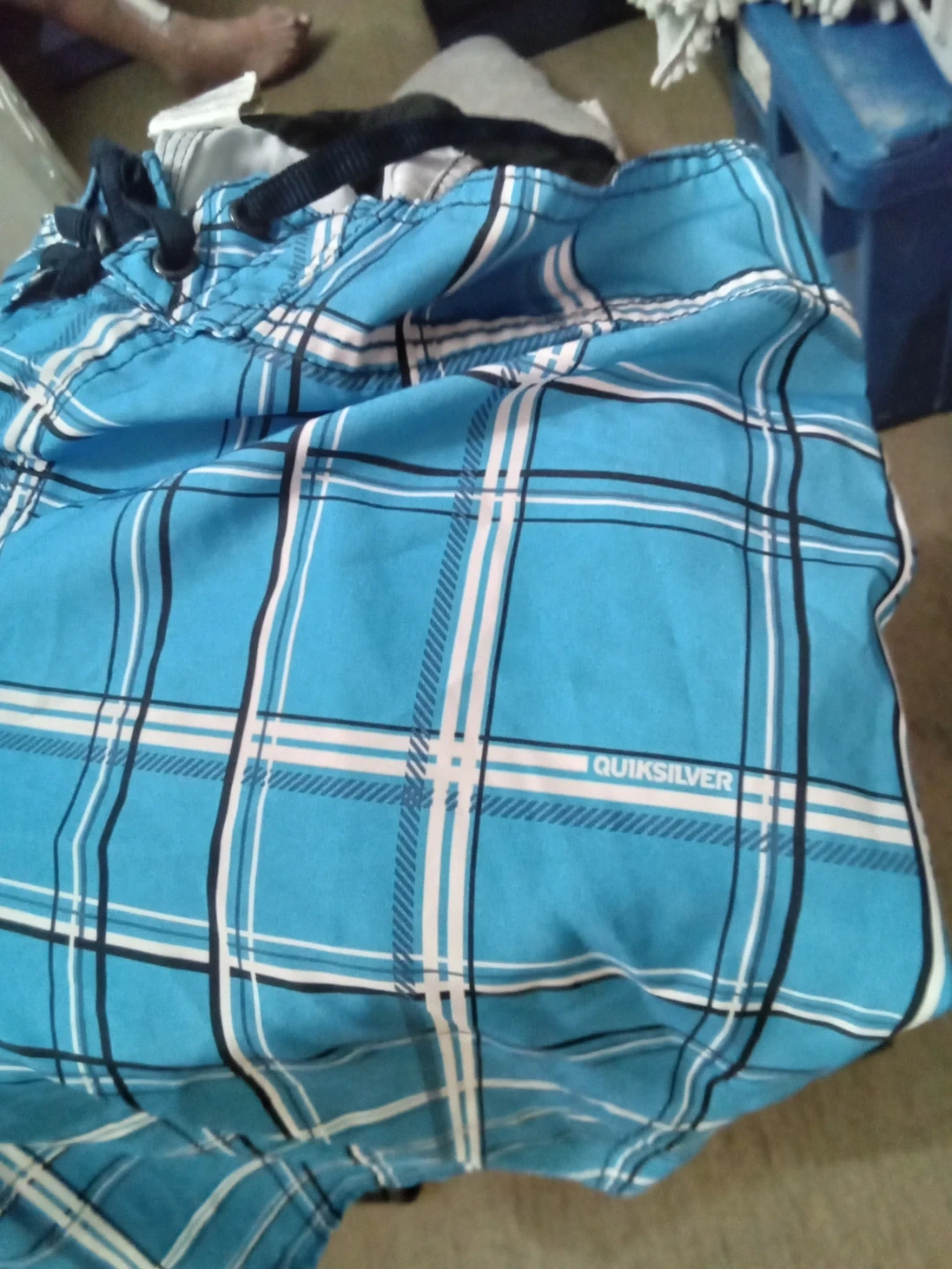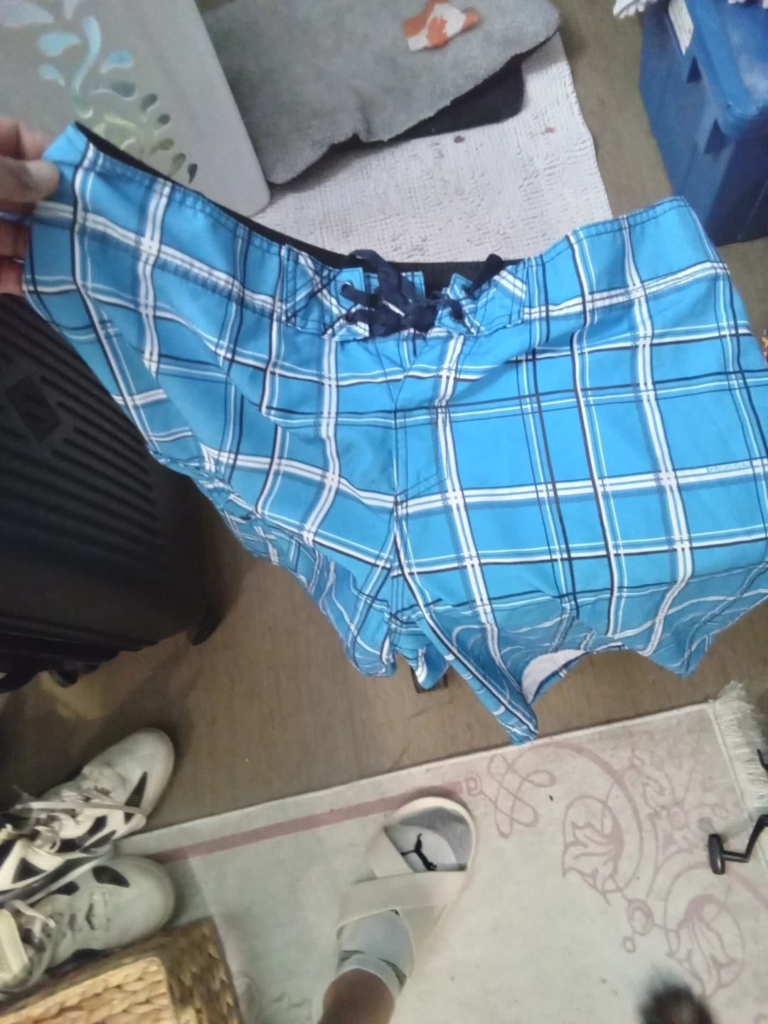 Quiksilver swim trunks in a blue and white plaid pattern. Size 34. Made of 93% polyester and 7% spandex. Perfect for swimming or just hanging out at the beach. $20 OBO...