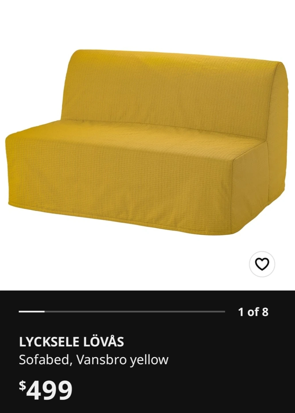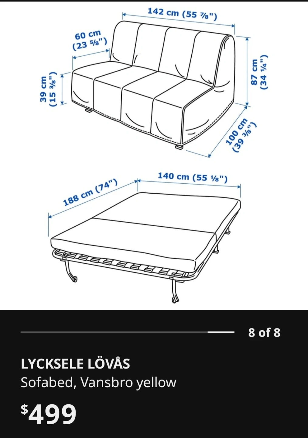 Selling an IKEA LYCKSELE LÖVÅS sofabed in Vansbro yellow. It's in great shape and ready for a new home! The original price was $499, practically unused, mattress definitely unused.