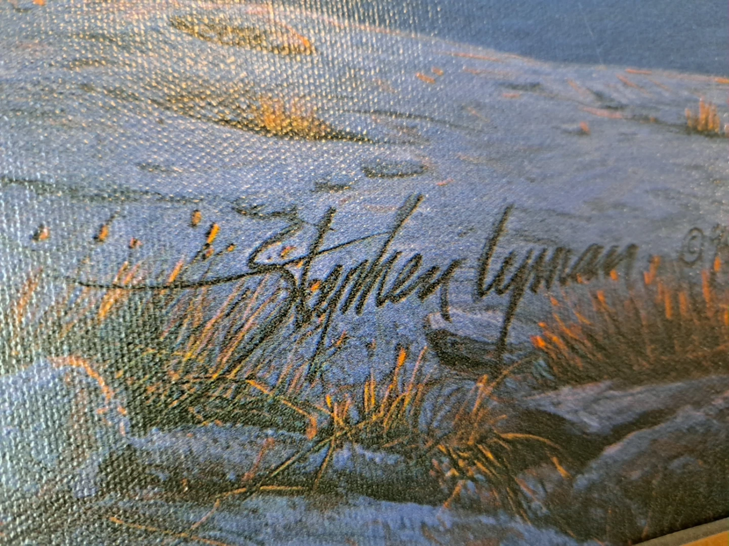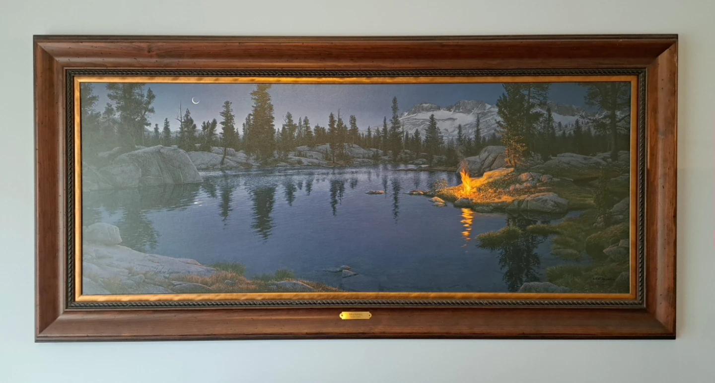 Steve painted a fall scene because it is only at that time of year that you can find such a plethora of subtle colors on the ground. Although this may not be a huge lake, there is an abundance of nature to enjoy. The piece contains all the subjects Steve loved to paint: fire, light, water, reflections, trees and rocks. Taking advantage of his ever-trusty artistic license, Steve was quick to point out that he would never build a fire this close to the water —especially in such a fragile and sensitive ecosystem.