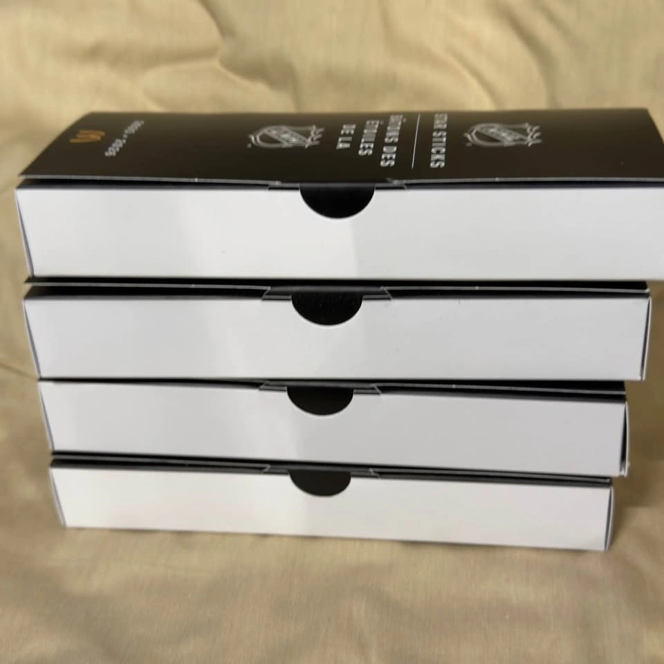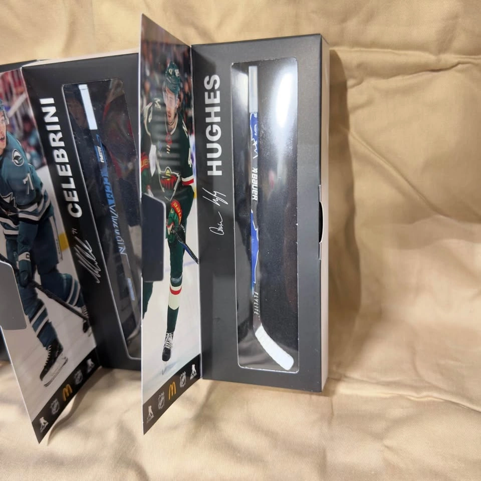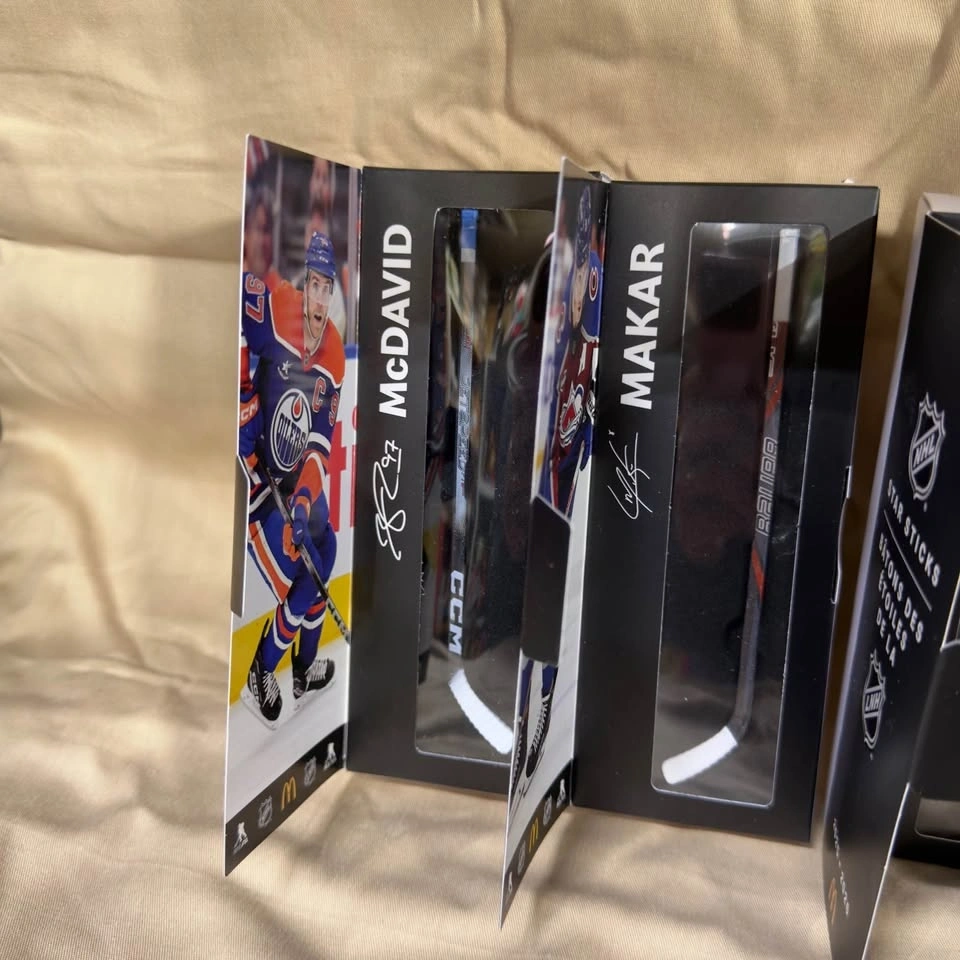 Cool set of 4 NHL mini hockey sticks featuring McDavid, Makar, Celebrini, and Hughes. Still in original boxes. Great for collectors or just for fun. Selling as a set.