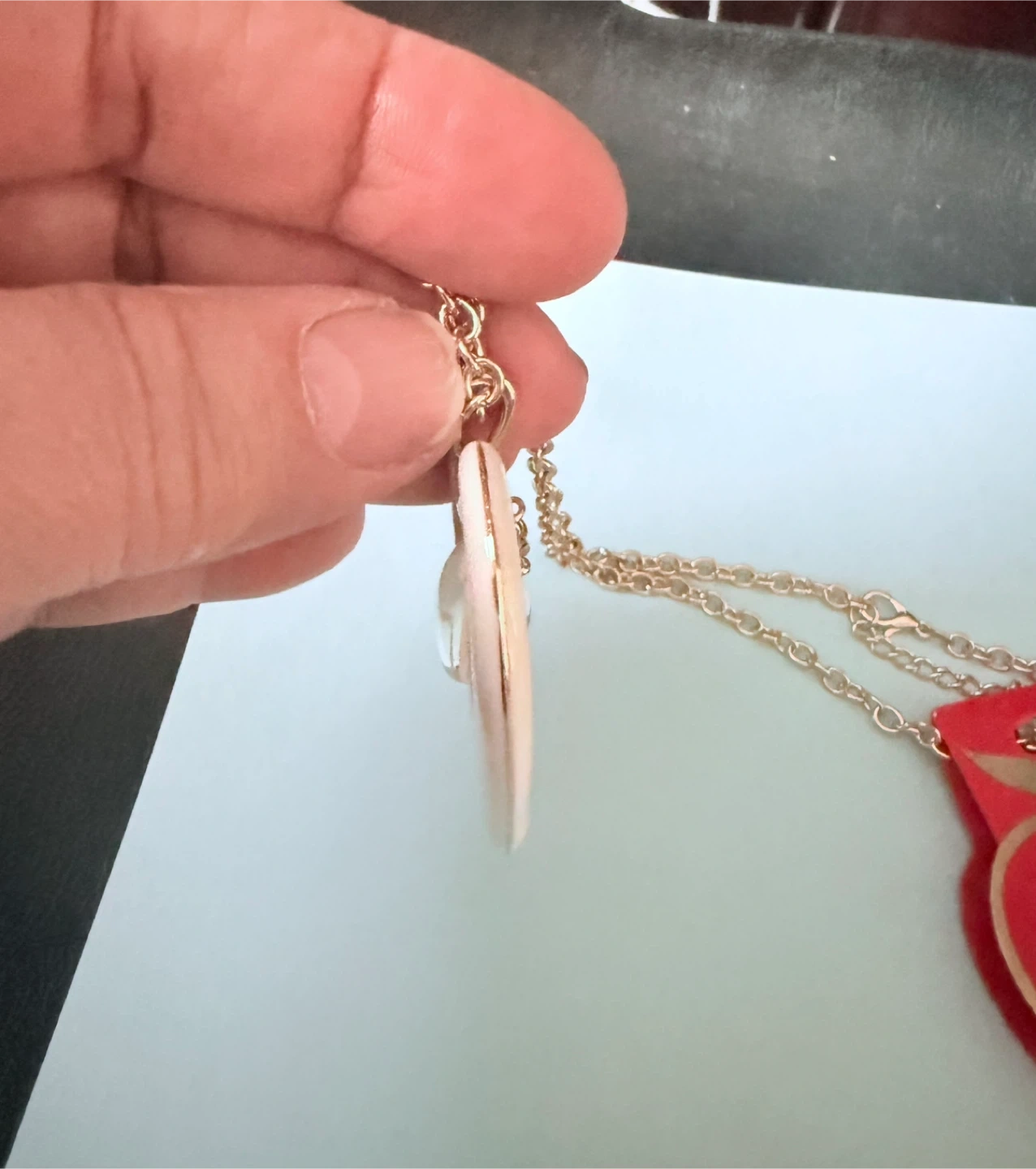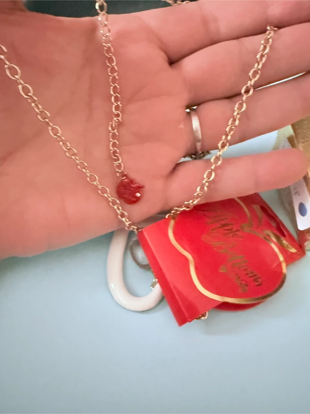 New with tag & box. Gold plated chain with a small, Crystal on the apple and a, large white heart pendant with gold trim, with a smaller clear heart charm inside.