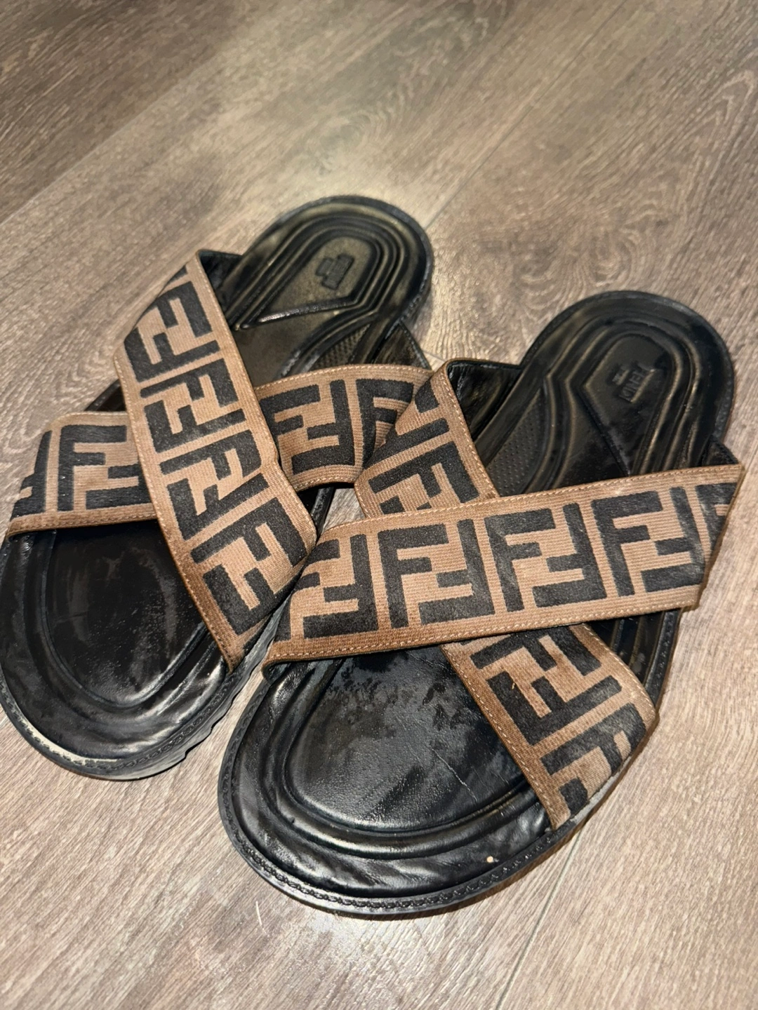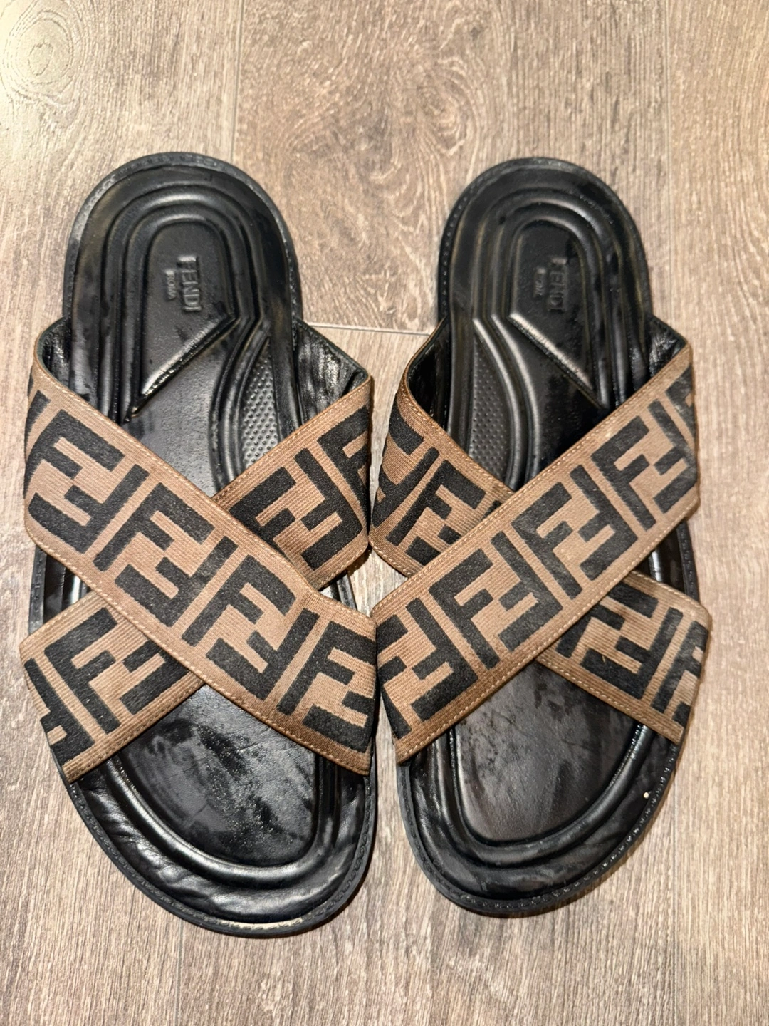 Slides with a criss-cross design. Features a brand pattern on the straps. These slides would be great for a relaxing day at the beach. Perfect for summer