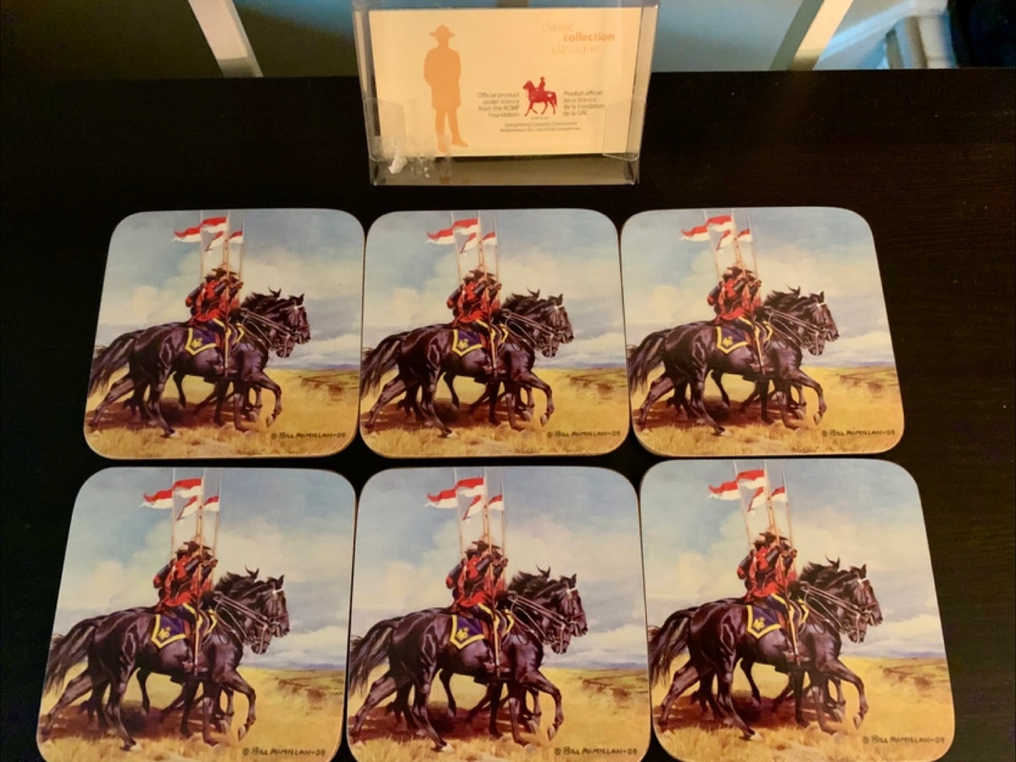 Set of six coasters featuring the classic RCMP (Royal Canadian Mounted Police) design from the Classic Collection. These coasters are in great condition and come with the original box.
