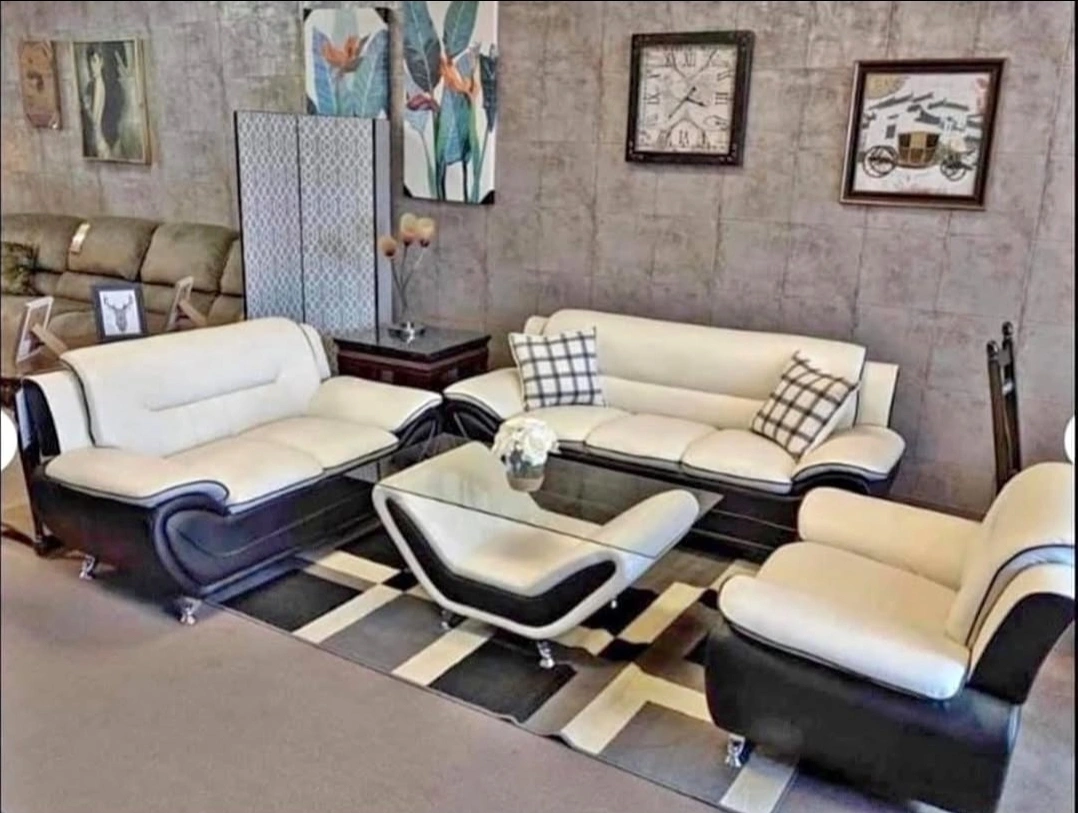 Stylish leather sofa set, featuring a white and black colour scheme. Includes a sofa, loveseat, and armchair. Great for a living room or family space!
