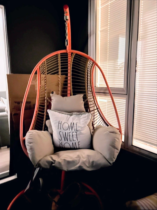 Relaxing hanging chair. Rattan weave with a coral coloured frame. Includes cushions. Perfect for a bedroom, living room or patio.