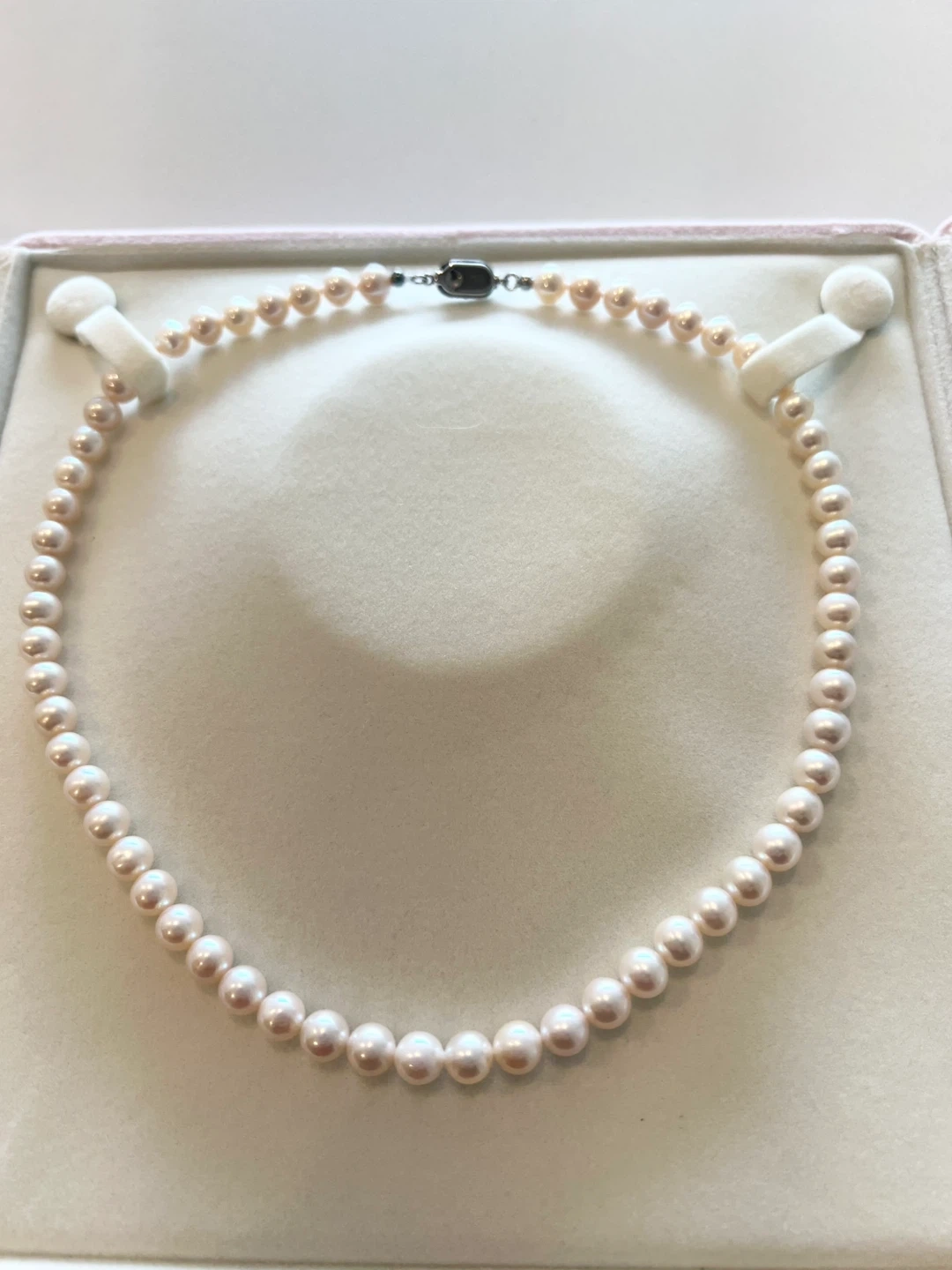 A delicate natural Pearl necklace presented in a light pink velvet box. The necklace features lustrous Pearls with a secure clasp closure. It's ready to be gifted or worn for special occasions!