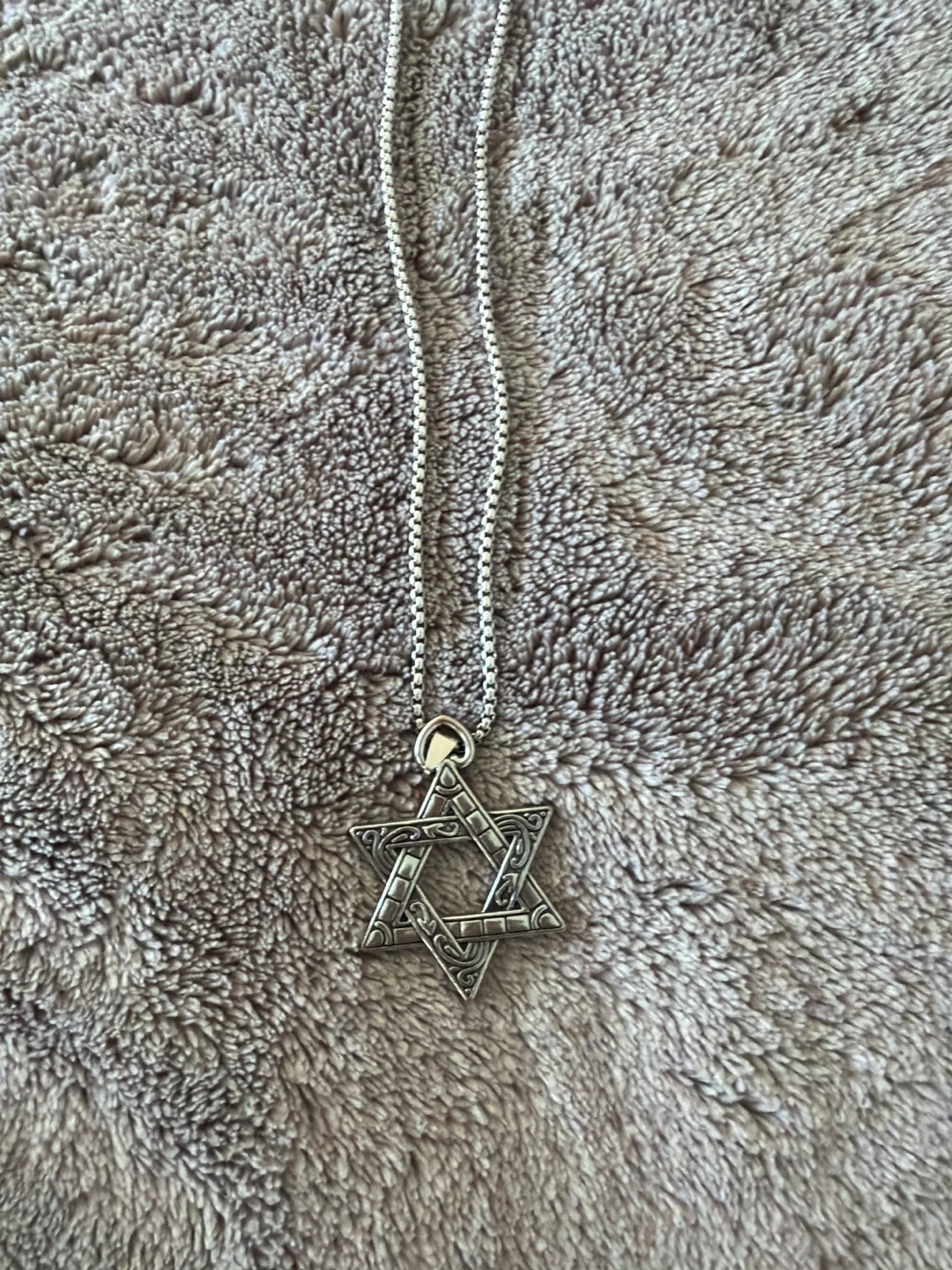 This necklace features a pendant shaped like the Star of David. The chain is made of a silver-toned metal. It's a nice accessory for everyday wear. It could be a thoughtful gift!