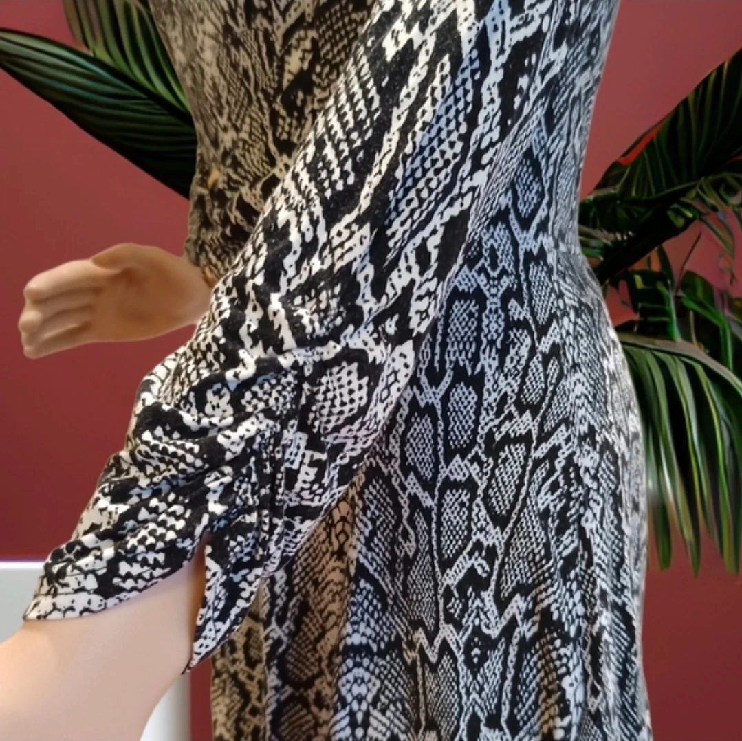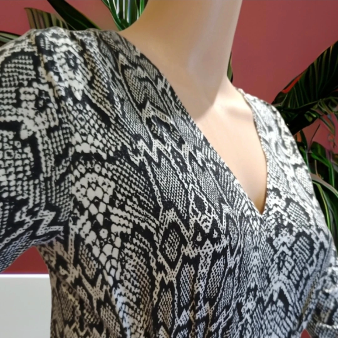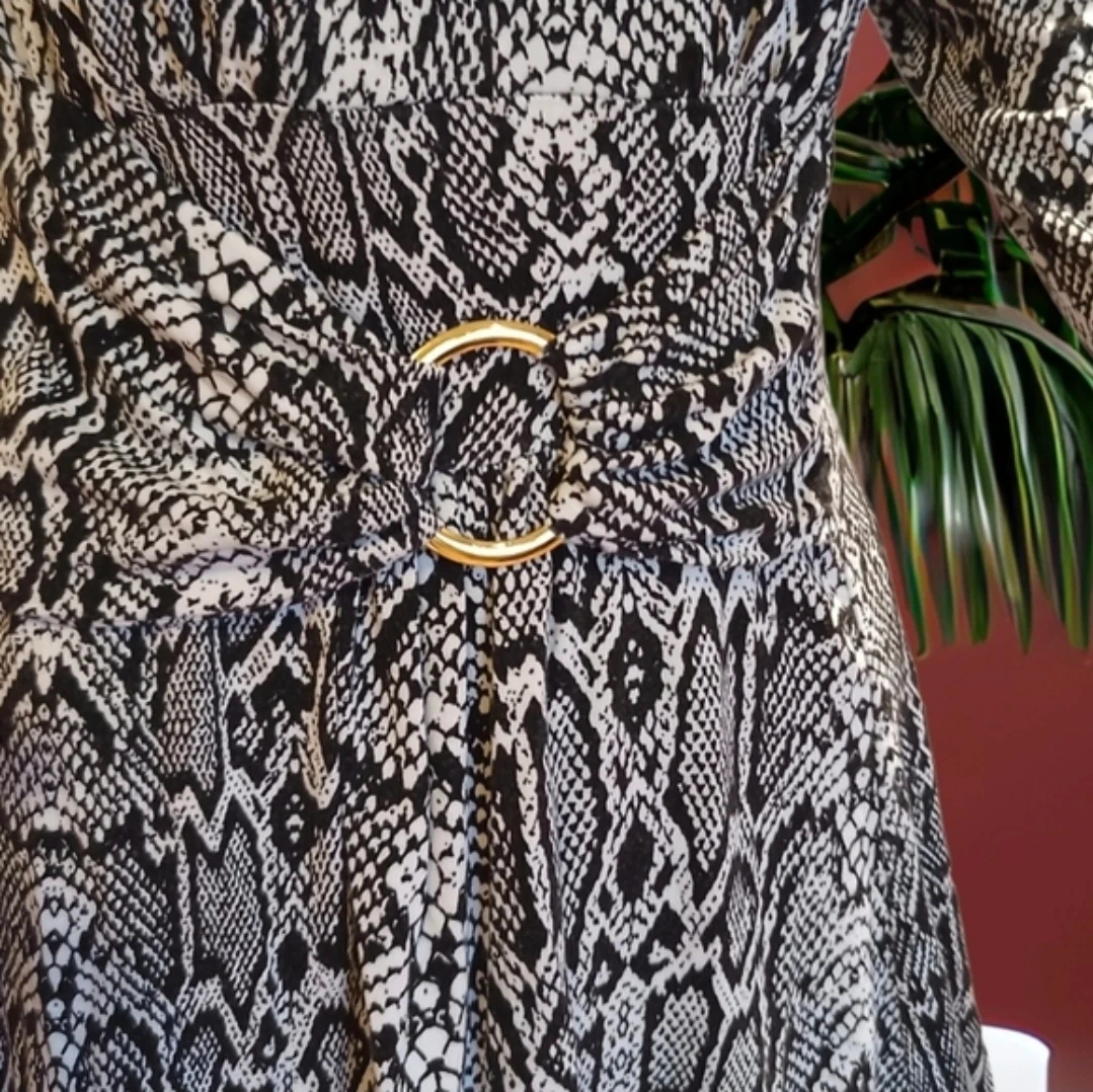 Liz Lange tunic in a black and white snake print. V-neckline and long sleeves. Elasticized waist with decorative buckle. Flared hem for a feminine drape. Easy to pair with leggings or jeans.