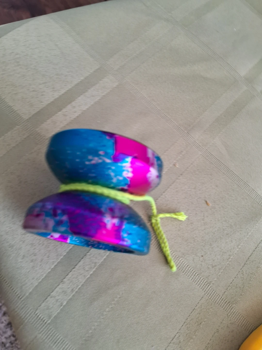 A bright blue yo-yo with pink and purple splatter accents. It's ready for some classic yo-yo tricks. This yo-yo is great for practicing new moves!