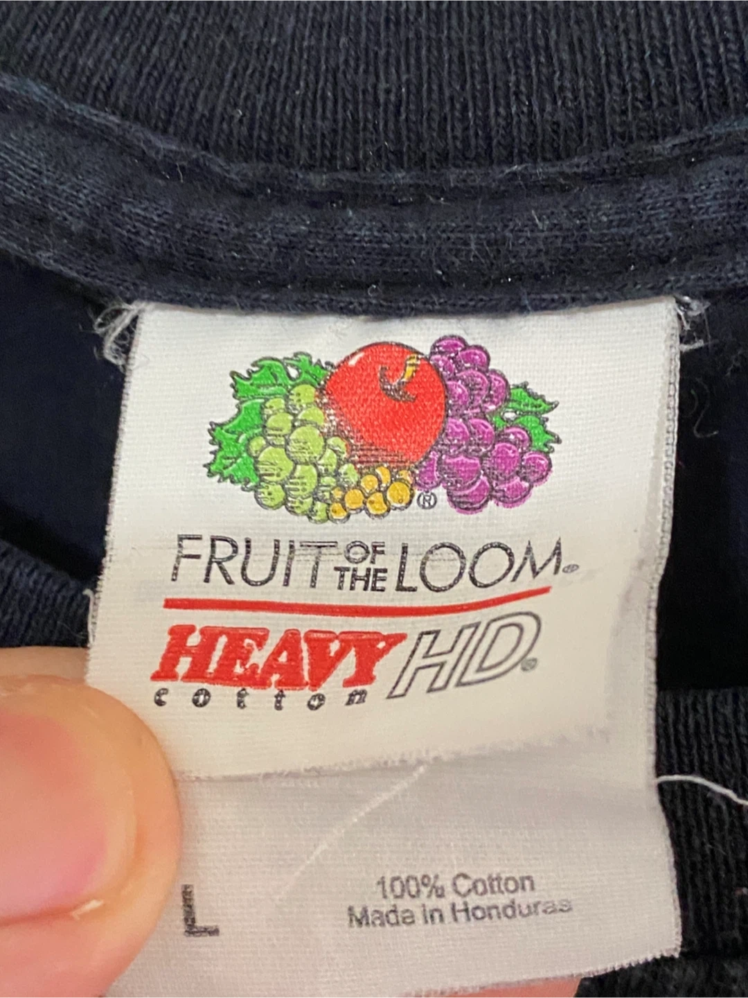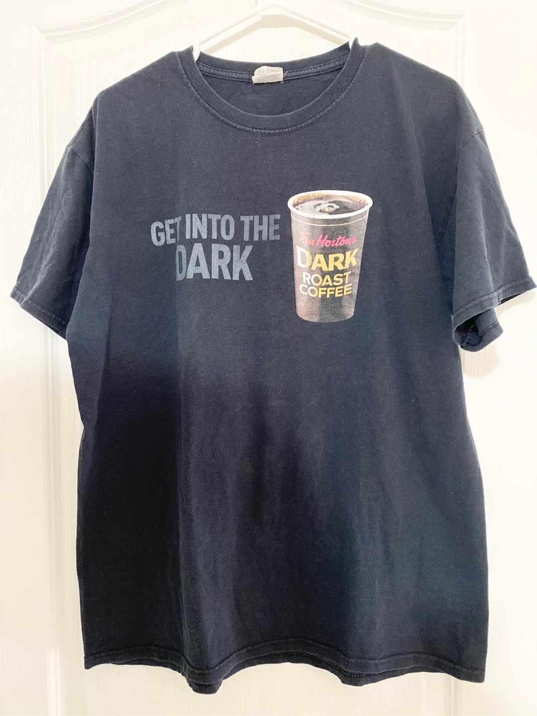 This black t-shirt features the Tim Hortons 'Dark Roast Coffee' graphic with the text 'GET INTO THE DARK'. It's made of 100% cotton. Size L. Graphic has some wear.