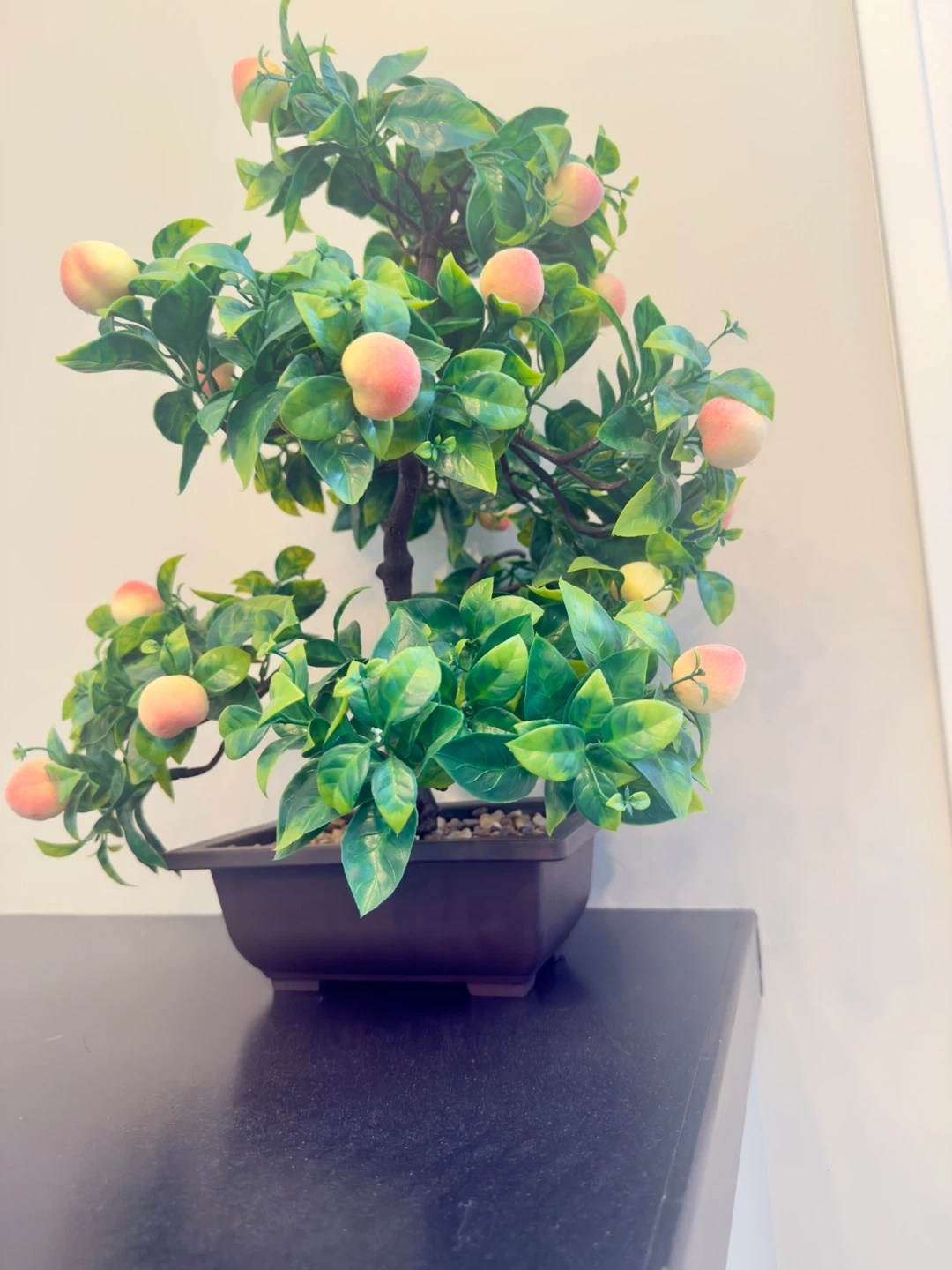 This is a lovely artificial peach tree bonsai, complete with realistic green leaves and small peach fruits. It's housed in a dark rectangular pot with decorative stones. It's a nice accent for any room!