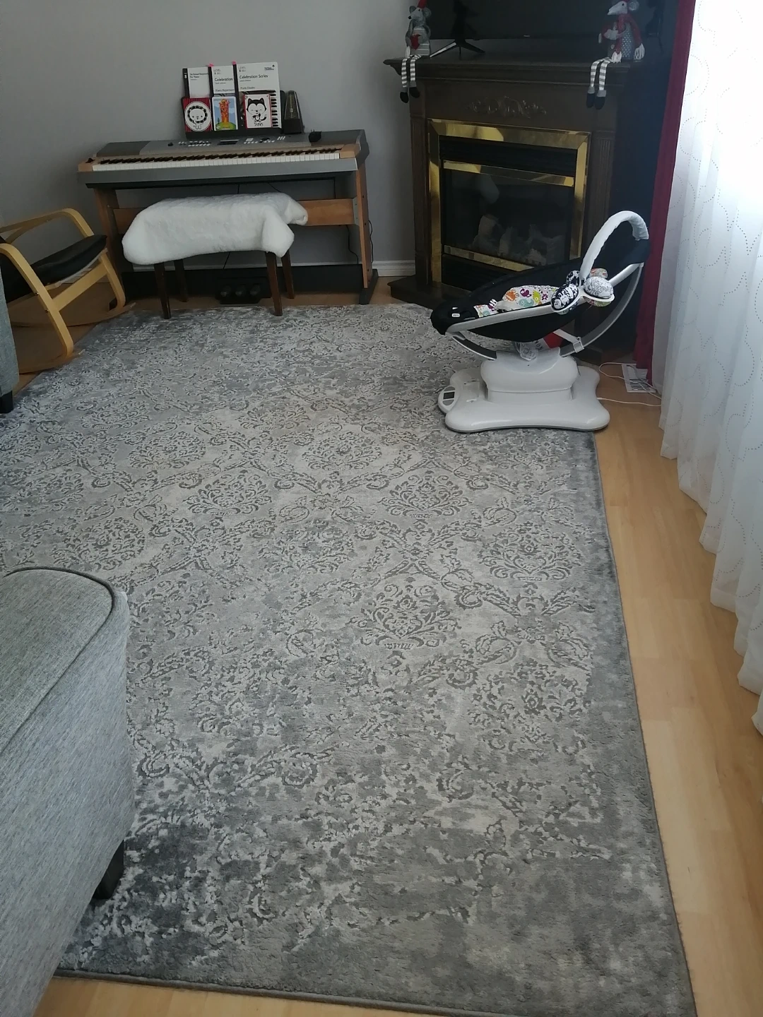 Selling a nice area rug with a grey patterned design. It would look great in any living room or bedroom. It's in good condition and ready for a new home!