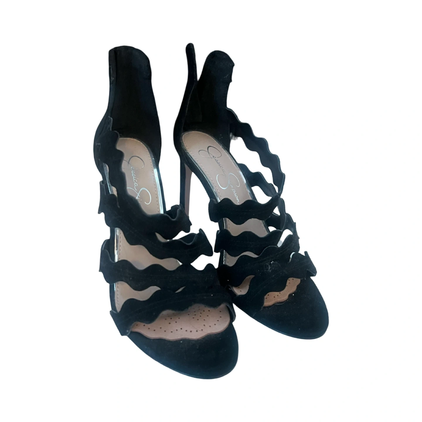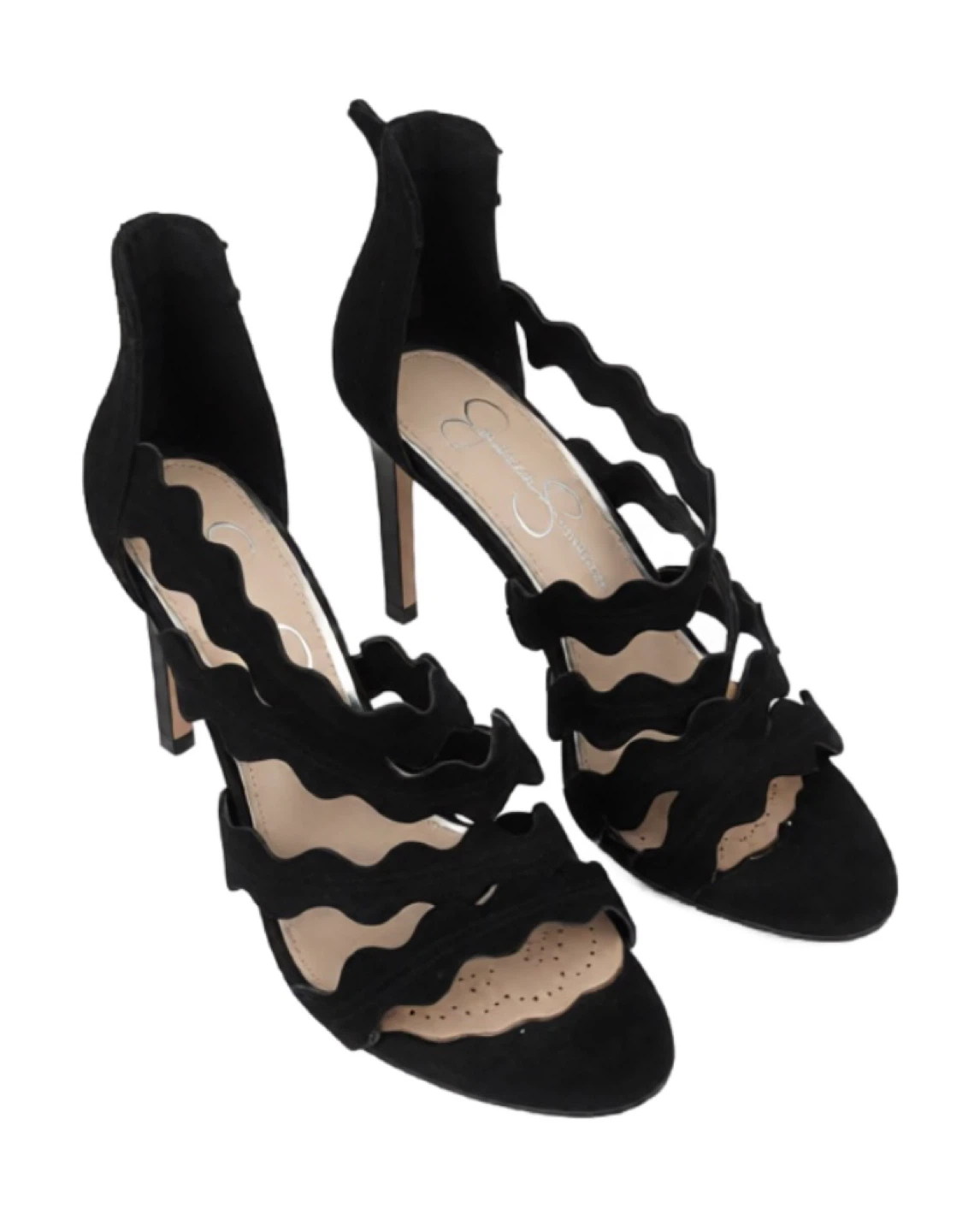 Elegant Jessica Simpson Caveena heels featuring a beautiful scalloped strap design and sleek stiletto heel. Soft black suede finish with back zipper closure for easy wear. Perfect for dressy occasions, nights out, or elevating any outfit.