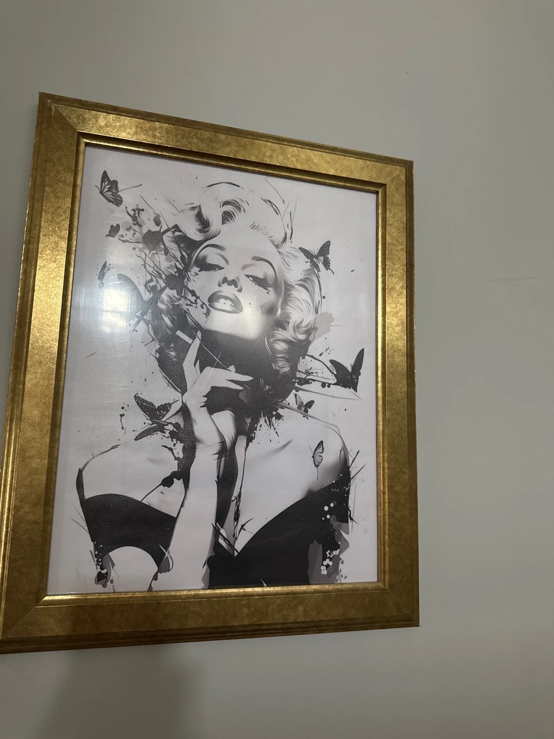 Framed wall art featuring a stylized black and white image of Marilyn Monroe with butterflies. It's presented in a decorative gold frame, adding a touch of elegance to any room. This piece is perfect for adding a statement to your decor.