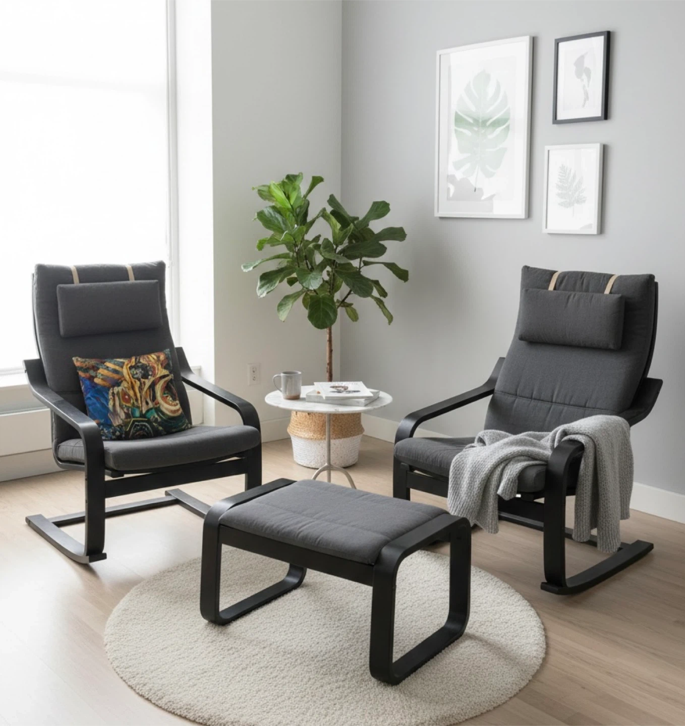 Selling a comfy IKEA Poang chair with matching ottoman in grey! It's in great shape and perfect for relaxing after a long day. The chair has a nice rocking motion and the ottoman provides extra support for your legs. Great addition to any living room or bedroom