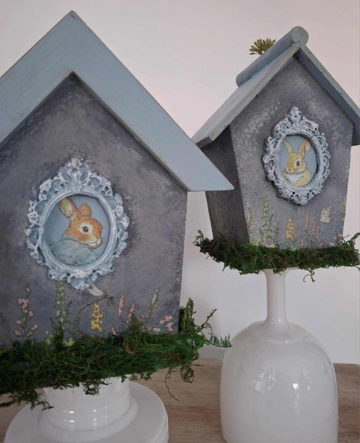 Birdhouse pair with Bunnies and Floral Accents