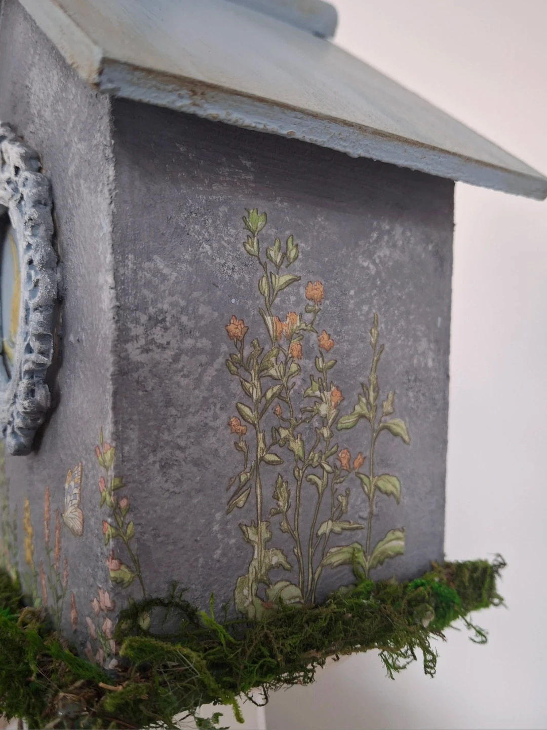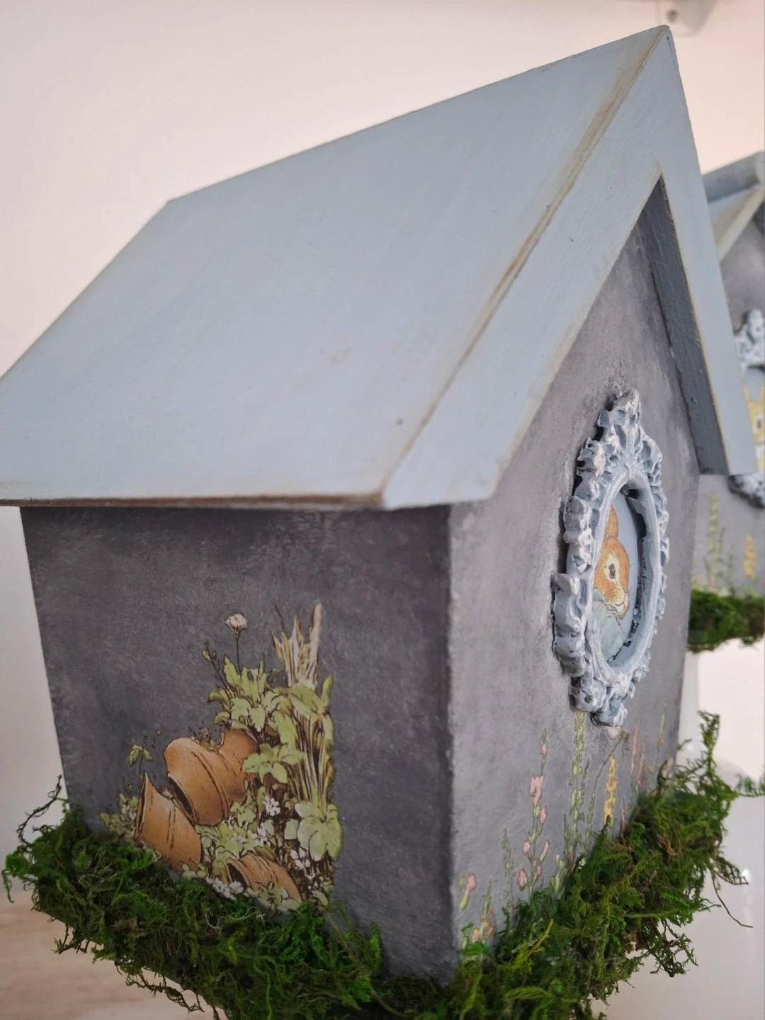 This charming pair of decorative birdhouses feature sweet Peter Cottontail portraits in ornate frames. Adorned with pretty floral and butterfly decals. A touch of moss adds a natural, rustic feel.