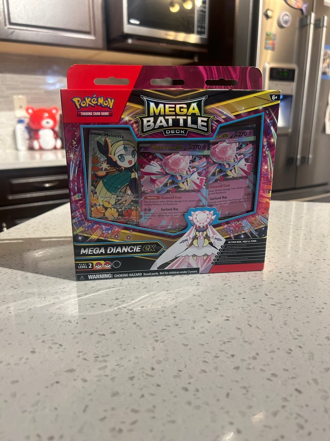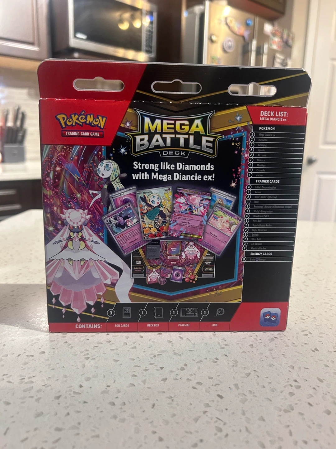 This is a Pokémon Mega Battle Deck featuring Mega Diancie ex! It's part of the trading card game and comes with foil cards, a deck box, a playmat, and a coin. This deck is suitable for ages 6 and up.
