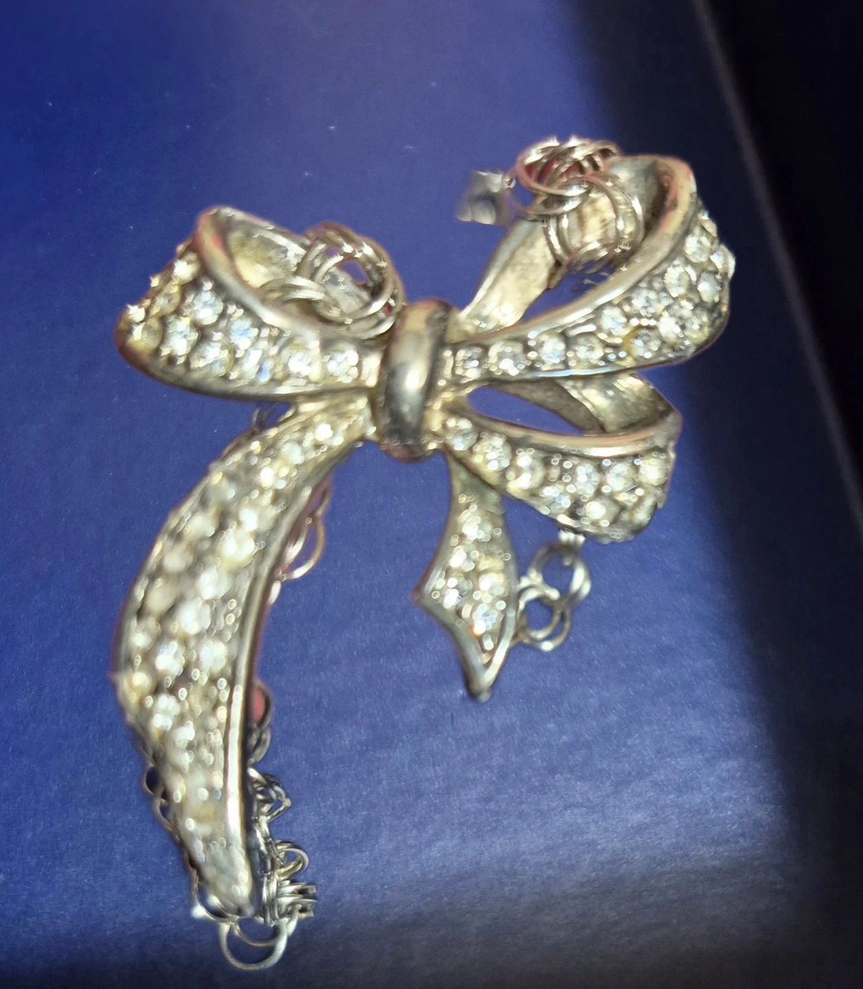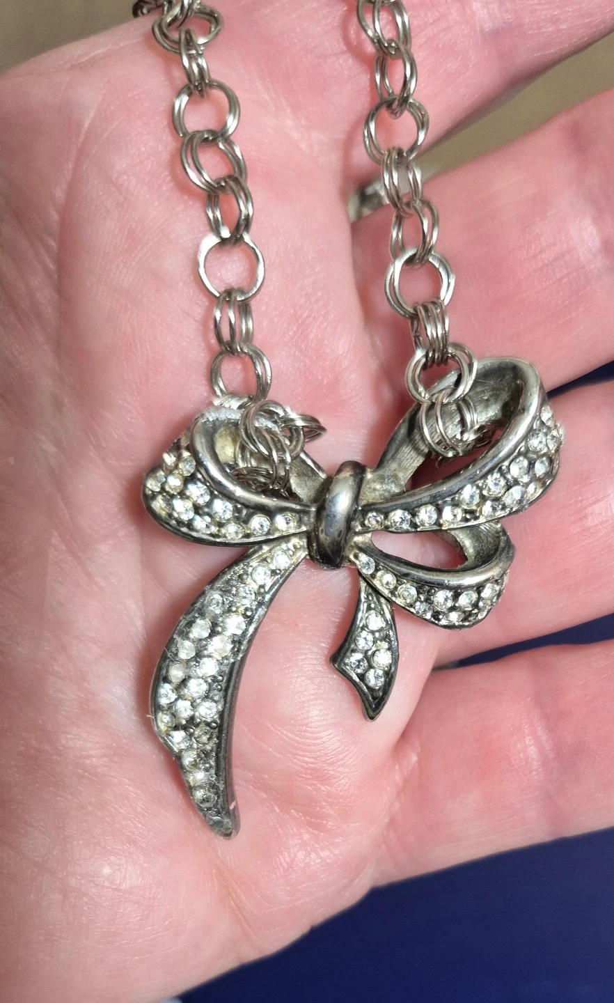 A charming silver-tone necklace featuring a sparkling bow pendant. It's perfect for adding a touch of elegance to any outfit. The chain is silver-tone and the pendant is encrusted with clear rhinestones.