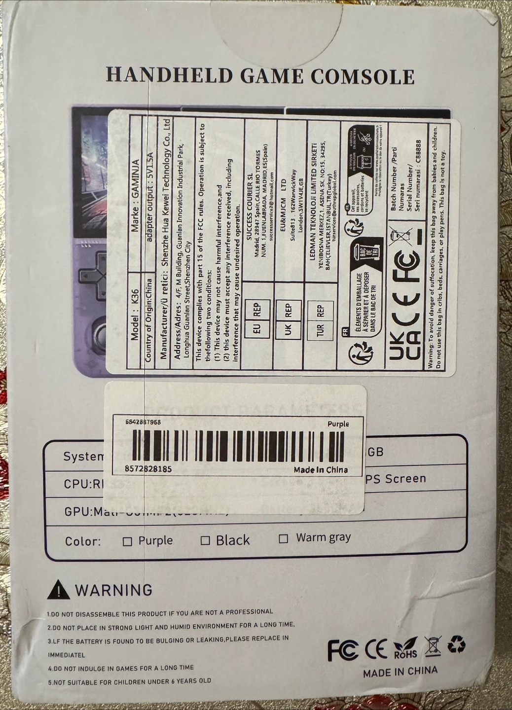 Selling a brand new sealed handheld game console, model K36. It features a 450x480 IPS screen and supports TF card loading. It comes with a rechargeable battery.