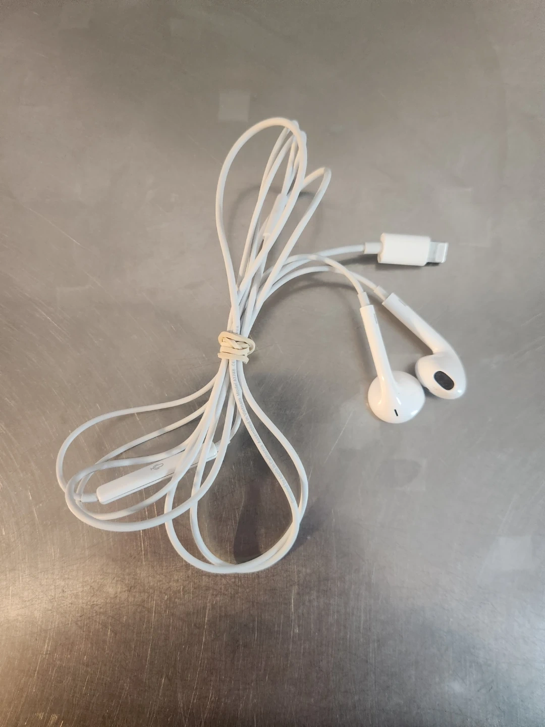 White Apple EarPods with Lightning connector for iPhones. Includes inline remote and microphone for calls and music control. Comes with cord organizer.